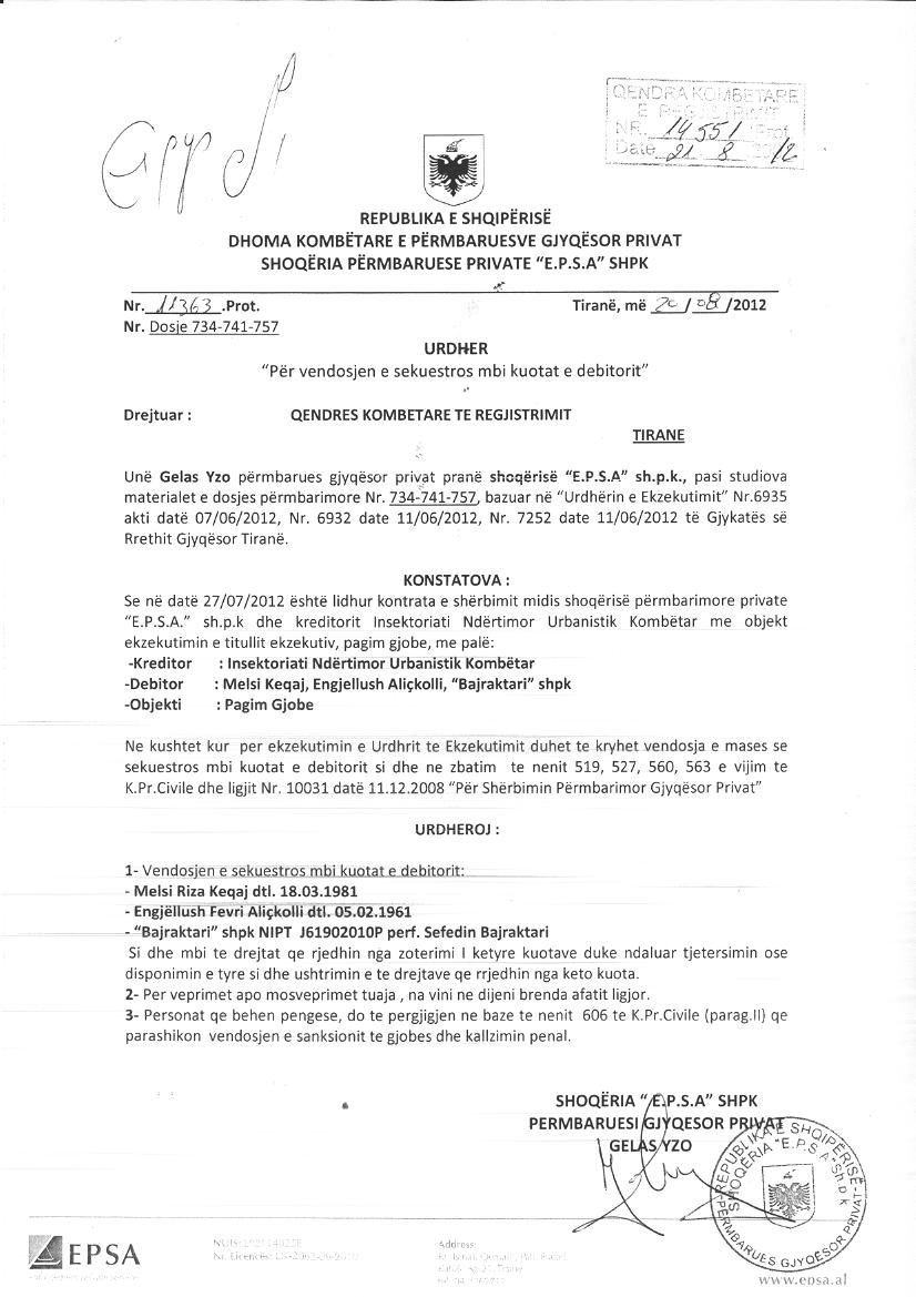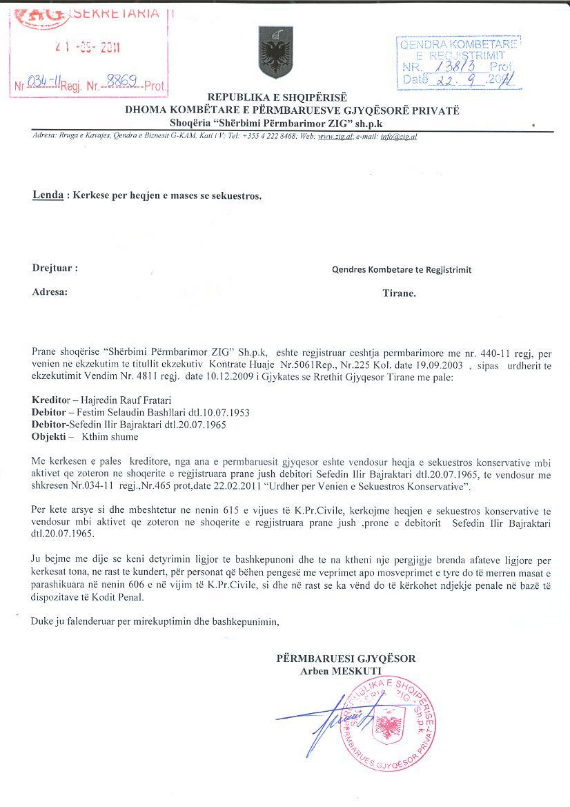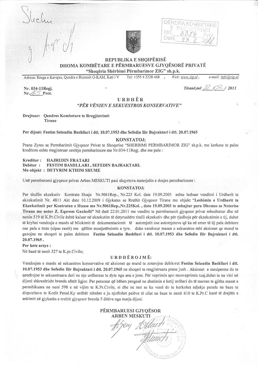 | Çështje Ligjore: | I.Me date 22.02.2011, me ane te urdherit nr.465 Prot, nr.034-11 Regj, " Per Venien e Sekuestros Konservative", e leshuar nga Shoqeria “Sherbimi Permbarimor ZIG" shpk drejtuar QKR, eshte urdheruar: Vendosja e mases se sekuestros konservative ne aksionet qe mund te zoterojne debitoret Festim Selaudin