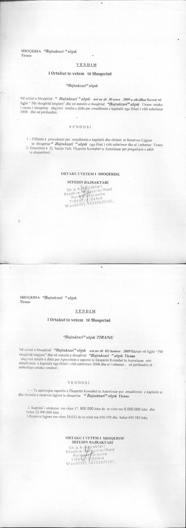 → Ekstrakti Historik i Regjistrit Tregtar date 21.06.2024 → Statuti fillestar dhe dokumenta te ndryshme → Statuti i perditesuar i Shoqerise → Urdher per venien e sekuestros konservative date 22.02.2011 → Kerkese per heqjen e mases se sekuestros konservative date 22.09.2011 → Urdher per vendosjen e sekuestros konservative date 20.08.2012 → Urdher per heqjen e sekuestros konservative date 26.03.2013 → Vendim i ortakut te vetem date 03.11.2009 → Urdher per vendosjen e sekuestros konservative date 08.02.2022 → Urdher per heqjen e sekuestros konservative date 31.03.2022 → Urdher per vendosjen e sekuestros konservative date 04.07.2022 → Urdher per heqjen e sekuestros konservative date 30.09.2020 |
