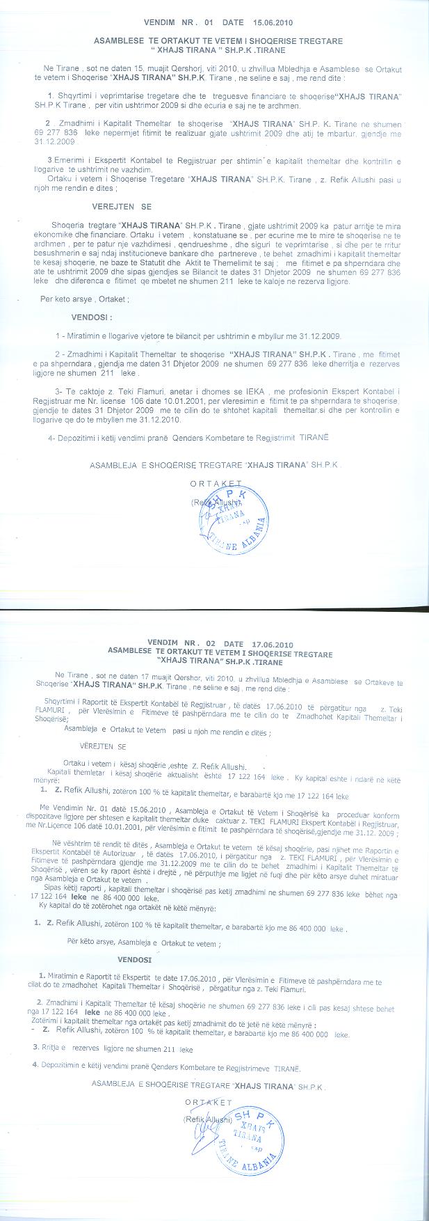 → Ekstrakt Historik i Regjistrit Tregtar date 01.05.2025 → Vendim i Asamblesë së Ortakut të Vetëm për Zmadhimin e Kapitalit datë 15.06.2010 |