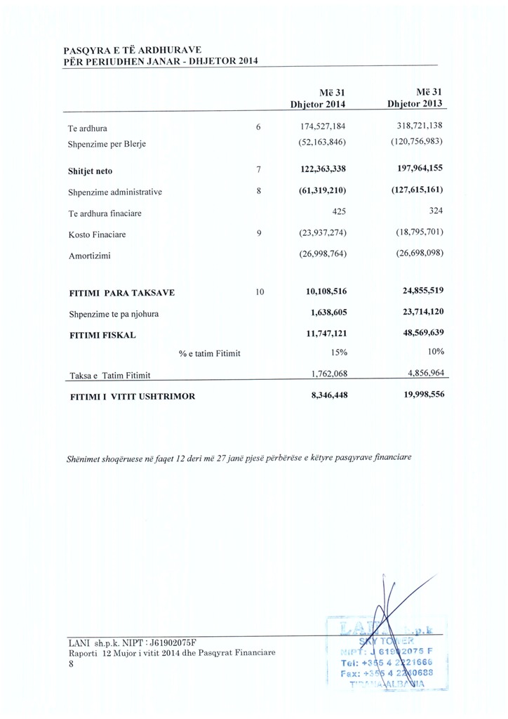 -40 207 678,00 Fitimi para Tatimit(Lekë) 2021: 27 136 816,00 Fitimi para Tatimit(Lekë) 2020: 14 858 508,00 Fitimi para Tatimit(Lekë) 2019: 23 900 754,00 Fitimi para Tatimit(Lekë) 2018: 28 637 517,00 Fitimi para Tatimit(Lekë) 2017: 16 226 776,00 Fitimi para Tatimit(Lekë) 2016: 17 824 884,00 Fitimi para Tatimit(Lekë) 2015: 1 726 633,00 Fitimi para Tatimit(Lekë) 2014: 10 108 516,00 Fitimi para Tatimit(Lekë) 2013: 24 855 519,00 Fitimi para Tatimit(Lekë) 2012: 52 051 923,00 Fitimi para Tatimit(Lekë) 2011: 79 591 530,00 Fitimi para Tatimit(Lekë) 2010: 171 752 057,00 Fitimi para Tatimit(Lekë) 2008: 77 990 943,00 Fitimi para Tatimit(Lekë) 2007: 14 623 895,00 |