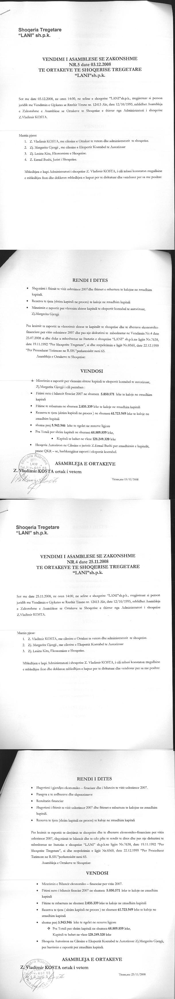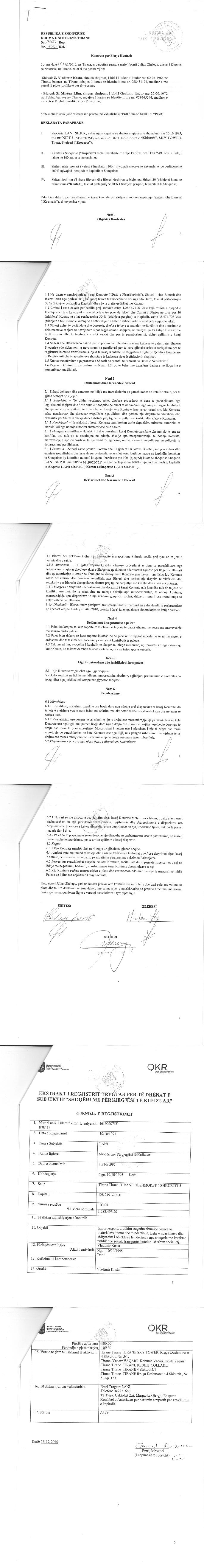 → Ekstrakti Historik i Regjistrit Tregtar date 06.06.2024 → Statuti fillestar dhe dokumenta te ndryshme → Statuti i shoqerise i perditesuar → Vendim i Asamblese se zakonshme te ortakeve date 25.11.2008 → Vendim i Asamblese se Pergjithshme te ortakeve date 18.10.2013 → Kontrate e blerjes se kuotave date 29.12.2010 → Urdher per venien e sekuestros konservative date 11.07.2016 → Vendim per pushimin e ekzekutimit date 16.12.2016 → Urdher per venien e sekuestros konservative date 05.09.2022 → Vendim i Asamblese se zakonshme te ortakeve date 08.03.2023 |