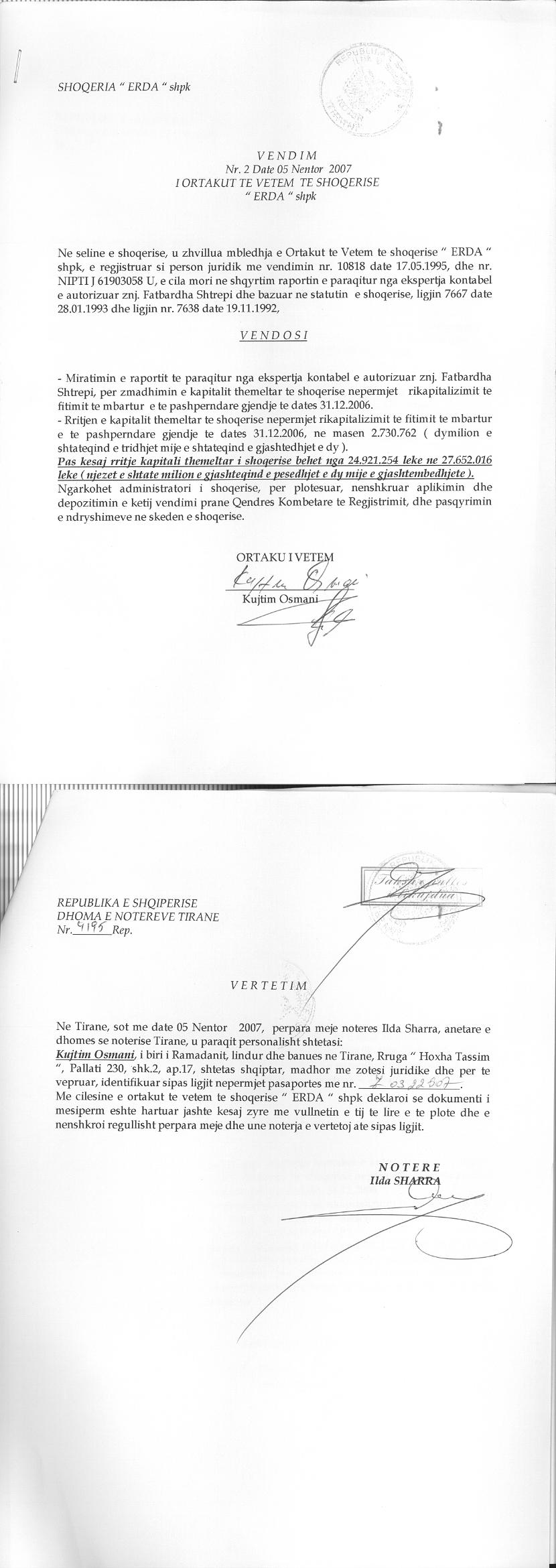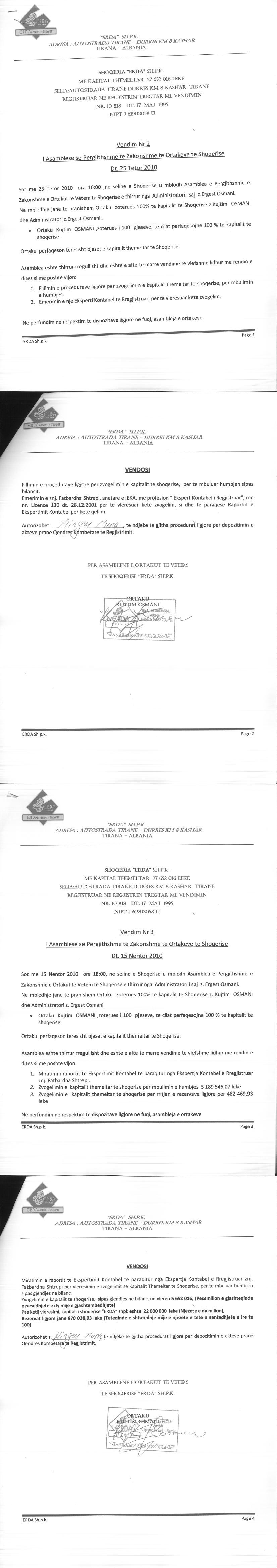→ Ekstrakt Historik i Regjistrit Tregtar date 09.10.2023 → Akt themelimi dhe Statuti i Shoqerise → Dokumente të Ndryshme → Kontratë Shitje Kuotash datë 21.07.2003 → Vendim i Ortakut të Vetëm, Zmadhim Kapitali datë 28.12.2005 → Vendim i Ortakut të Vetëm, Zmadhim Kapitali datë 05.11.2007 → Vendim i Asamblesë së Ortakëve, Zvogëlim Kapitali datë 25.10.2010 → Urdhër për Vënien e Sekuestros datë 05.05.2014 → Urdhër për Heqjen e Sekuestros datë 08.05.2014 → Vendim i Asamblesë së Ortakut të Vetëm, Zmadhim Kapitali datë 15.10.2014 → Vendim i Asamblesë së Ortakut të Vetëm, Zmadhim Kapitali datë 15.12.2019 → Dëshmi Trashëgimie Ligjore datë 26.04.2021 → Kontratë Dhurimi Kuotash datë 28.12.2021 → Ekstrakt Historik i Regjistrit Tregtar date 17.04.2024 → Vendim i Asamblesë së Ortakut, Zmadhim Kapitali datë 24.11.2023 → Të dhënat e Investimit, Financimet Nga IPARD - Aksesuar nga Agjencia për Zhvillim Bujqësor dhe Rural AZHBR datë 17.04.2024 |
