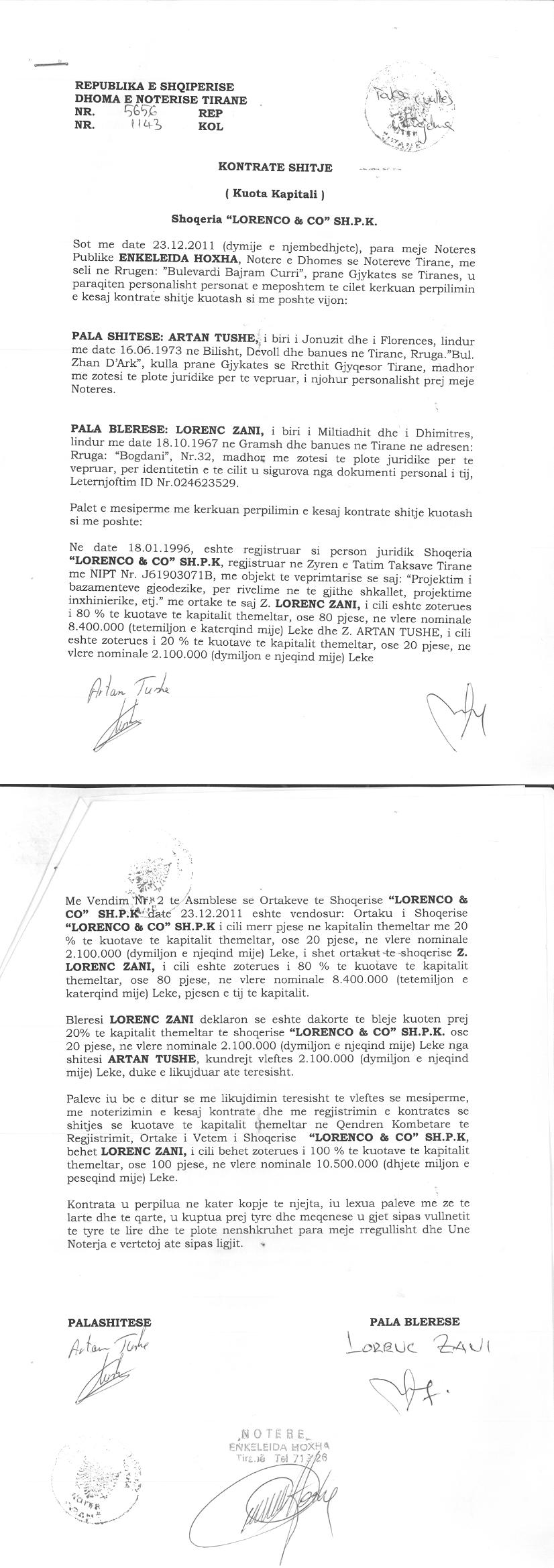 → Ekstrakt historik i regjistrit tregtar 28.05.2021 → Akti i themelimit → Kontrate shitblerje kuotash 02.08.2002 → Kontrate shitje kuotash 21.04.2006 → Kontrate shitje kuotash kapitali 23.12.2011 |