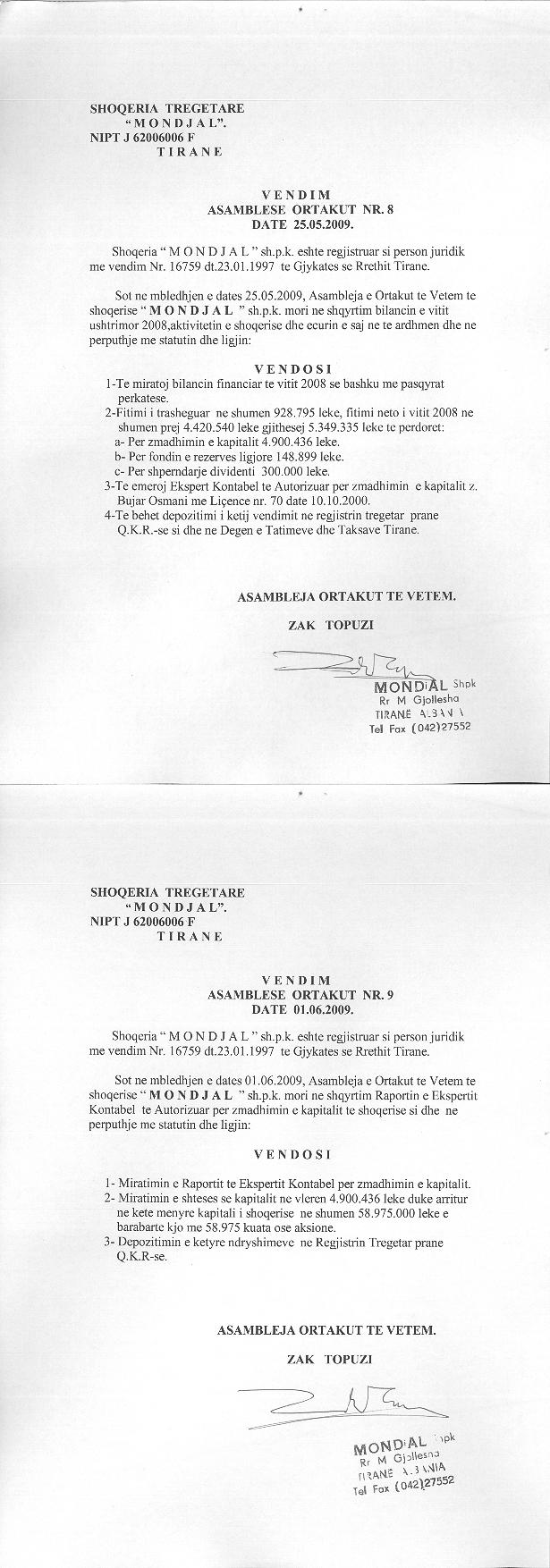 IV. Me date 02.06.2010, me vendim te ortakut te vetem, realizohet zmadhimi i kapitalit te shoqerise nepermjet fimit neto te vitit 2009 ne shumen totale 4.600.000 (kater milion e gjashteqind mije) leke. Pas zmadhimit, kapitali do te behet 63.575.000 (gjashtedhjete e tre milion e peseqind e shtatedhjete e pese mije) leke.