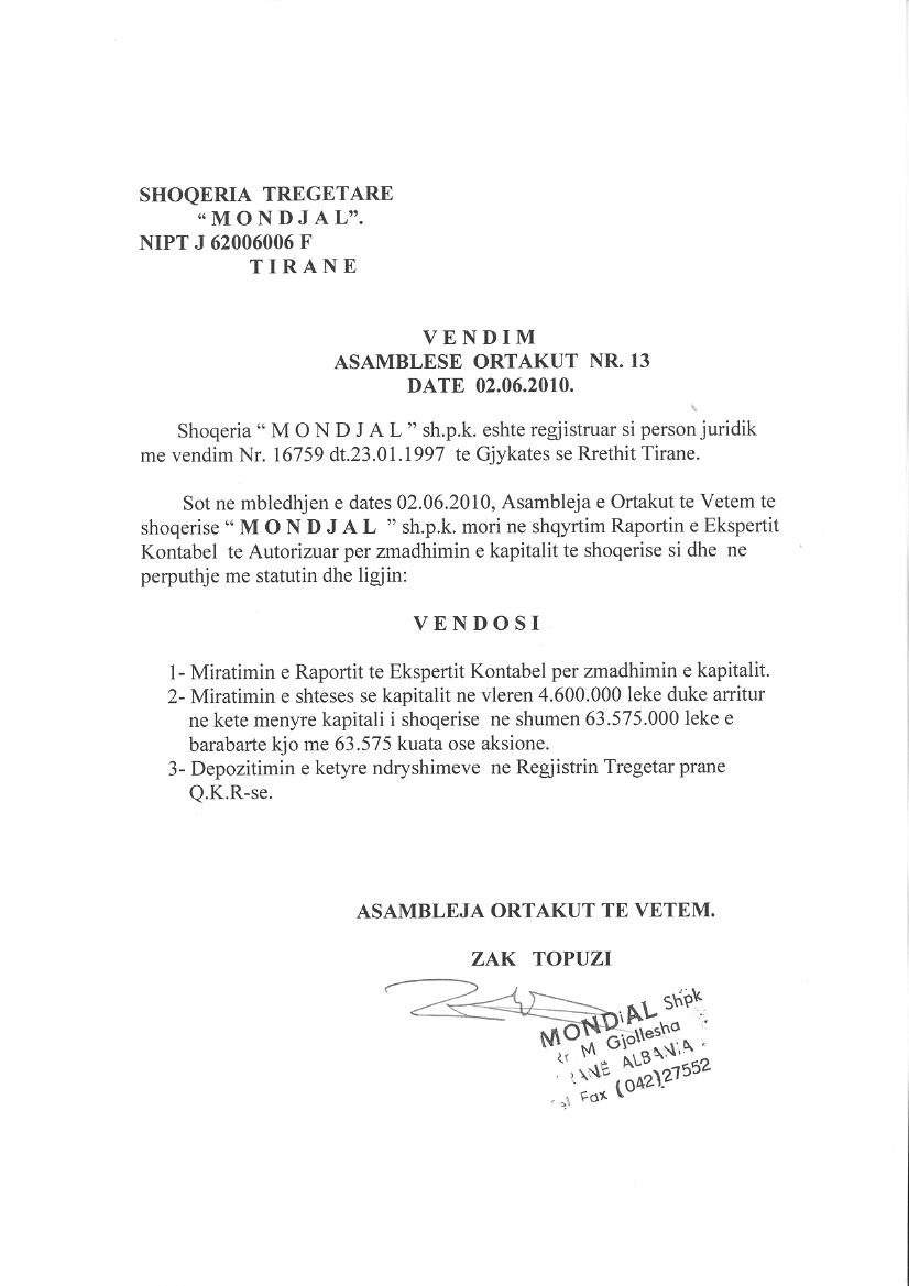 VII. Me date 09.07.2013, me vendim te ortakut te vetem, realizohet zmadhimi i kapitalit te shoqerise nepermjet fimit neto te vitit 2012 ne shumen totale 3.000.000 (tre milion) leke. Pas zmadhimit, kapitali do te behet 74.575.000 (shtatedhjete e kater milion e peseqind e shtatedhjete e pese mije) leke.