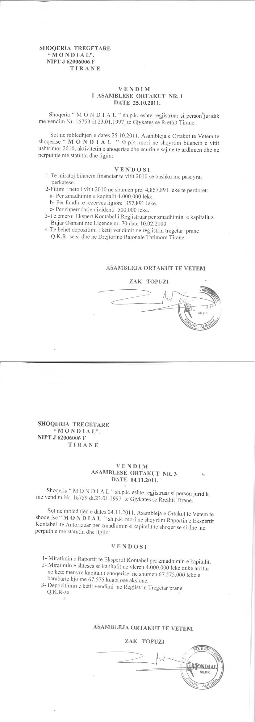 V. Me date 04.11.2011, me vendim te ortakut te vetem, realizohet zmadhimi i kapitalit te shoqerise nepermjet fimit neto te vitit 2010 ne shumen totale 4.000.000 (kater milion) leke. Pas zmadhimit, kapitali do te behet 67.575.000 (gjashtedhjete e shtate milion e peseqind e shtatedhjete e pese mije) leke.