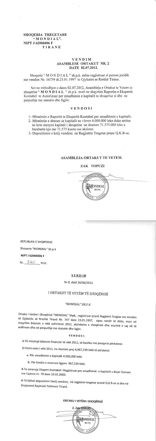 VI. Me date 02.07.2012, me vendim te ortakut te vetem, realizohet zmadhimi i kapitalit te shoqerise nepermjet fimit neto te vitit 2011 ne shumen totale 4.000.000 (kater milion) leke. Pas zmadhimit, kapitali do te behet 71.575.000 (shtatedhjete e nje milion e peseqind e shtatedhjete e pese mije) leke.