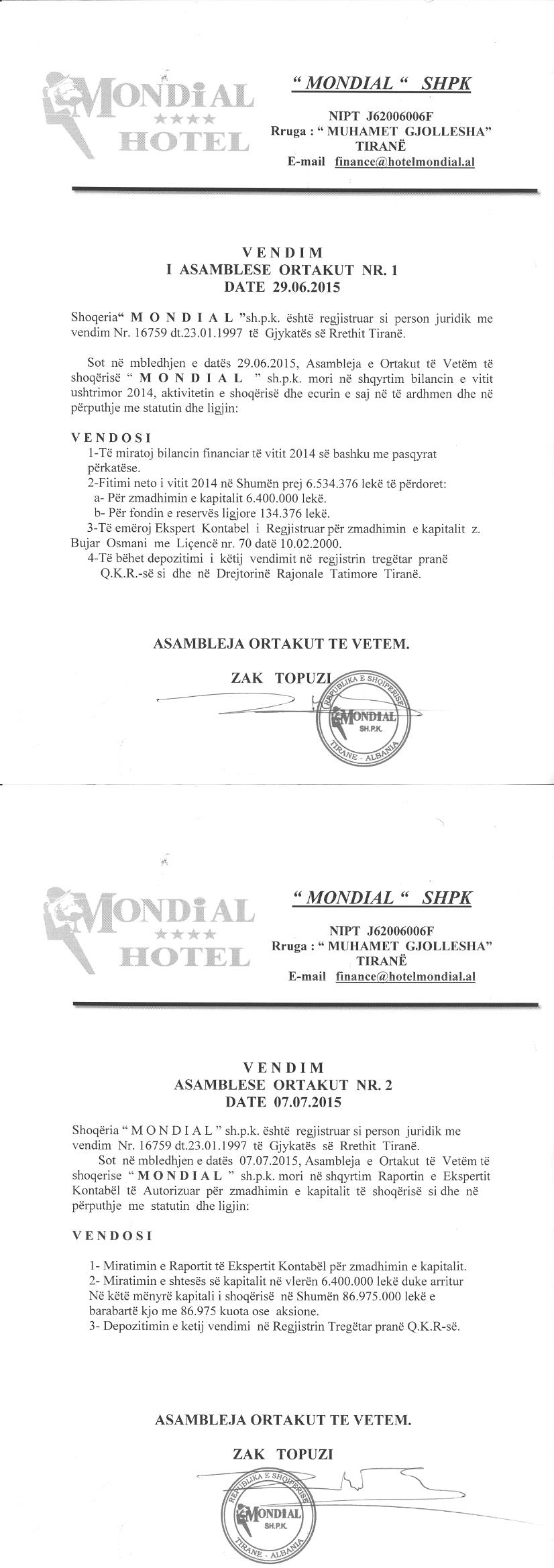 IX. Me date 07.07.2015, me vendim te ortakut te vetem, realizohet zmadhimi i kapitalit te shoqerise nepermjet fimit neto te vitit 2014 ne shumen totale 6.400.000 (gjashte milion e katerqind mije) leke. Pas zmadhimit, kapitali do te behet 86.975.000 (tetedhjete e gjashte milion e nenteqind e shtatedhjete e pese mije) leke.