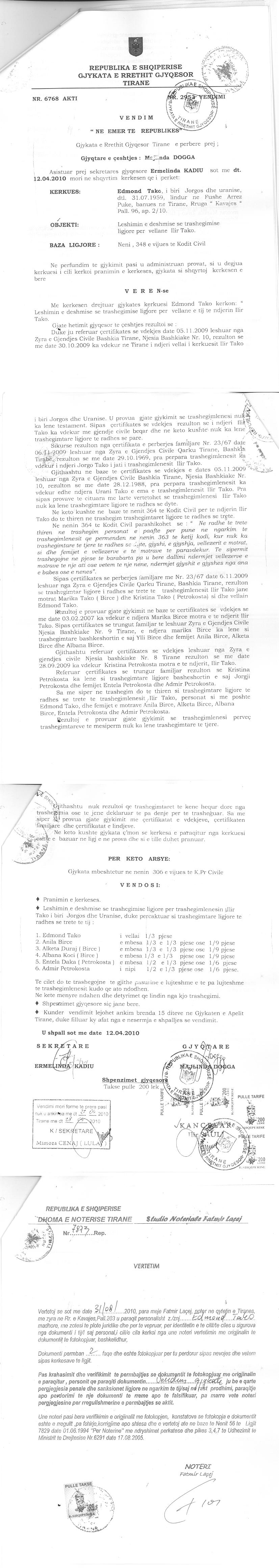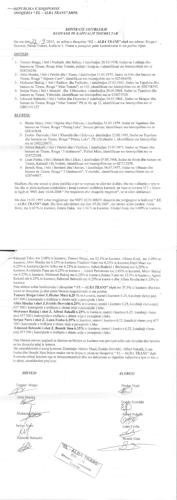 → Ekstrakt Historik i Regjistrit Tregtar date 01.06.2023 → Akt themelimi dhe Statuti i Shoqerise → Kontrate Shitblerje Kuotash date 11.03.1999 → Kontrate Shitje Kuotash date 27.01.2001 → Kontrate Shitje Kuotash date 08.05.2001 → Kontrate Shitje Kuotash date 07.05.2002 → Kontrate Shitje Kuotash date 12.11.2002 → Vendimi i Gjykates se Rrethit Gjyqesor Tirane, Leshimi i Deshmise se Trashegimise Ligjore date 13.12.2006 → Kontrate Shitje Kuotash date 18.05.2007 → Vendim i Asamblese se Ortakeve, Zmadhim Kapitali date 15.07.2010 → Vendimi i Gjykates se Rrethit Gjyqesor Tirane, Leshimi i Deshmise se Trashegimise Ligjore date 12.04.2010 → Kontrate Shitblerje Kuotash date 22.09.2015 → Kontrate Shitblerje Kuotash date 30.03.2018 → Kontrate Shitblerje Kuotash date 23.07.2018 → Kontrate Shitblerje Kuotash date 08.10.2019 |