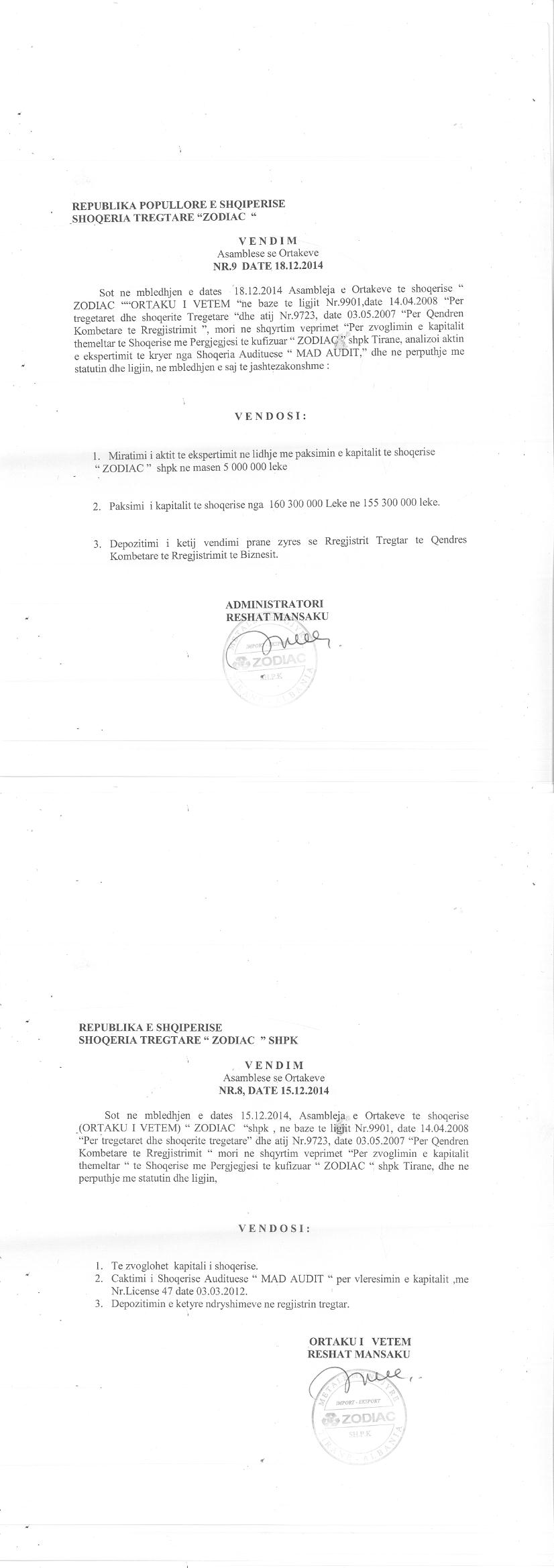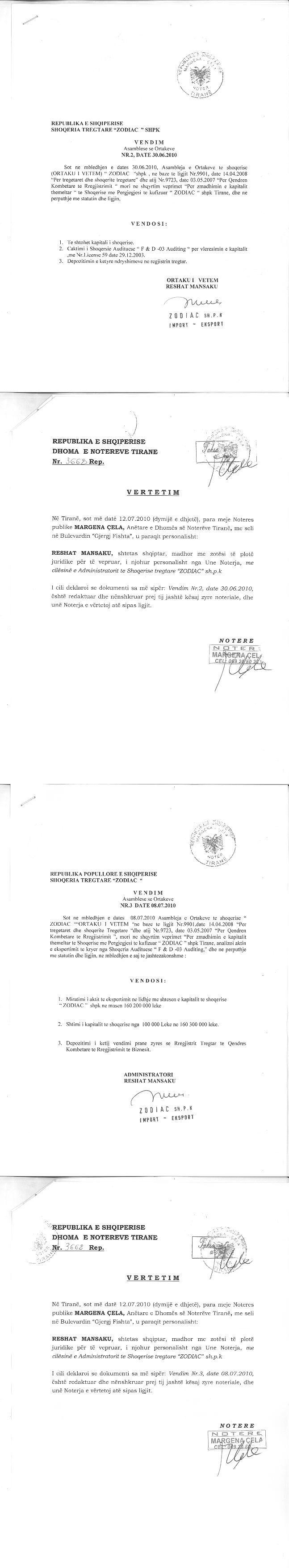 → Ekstrakt Historik i Regjistrit Tregtar date 03.11.2023 → Akt themelimi dhe Statuti i Shoqerise → Vendim i Asamblesë së Ortakëve, Zmadhim Kapitali datë 08.07.2010 → Vendim i Asamblesë së Ortakëve, Zmadhim Kapitali datë 18.12.2014 |