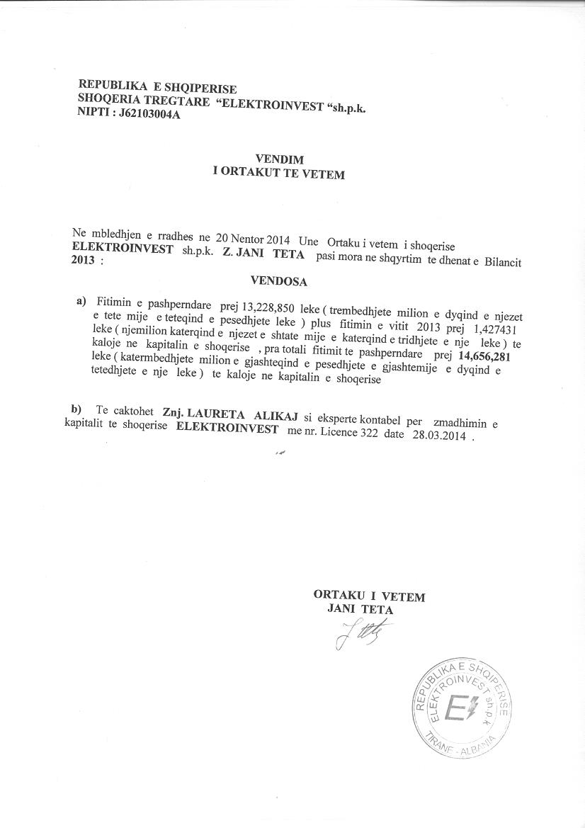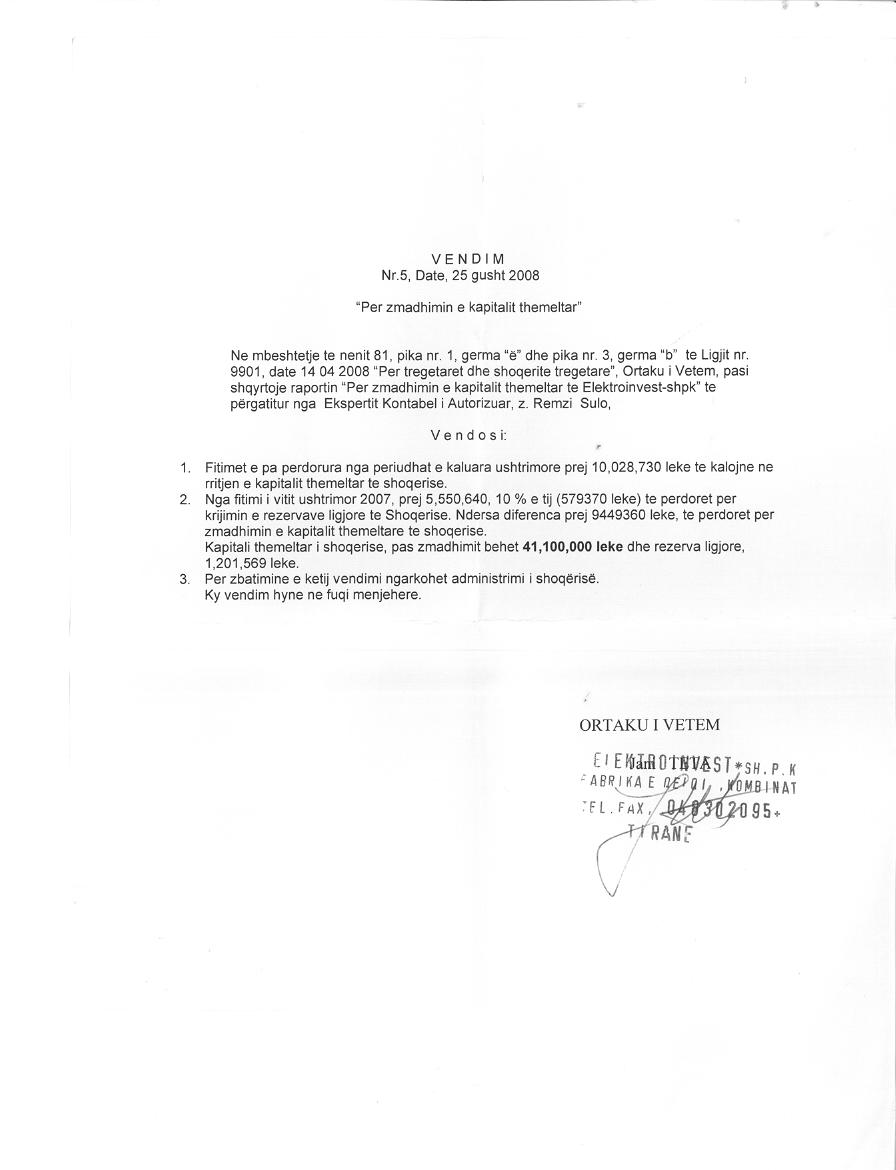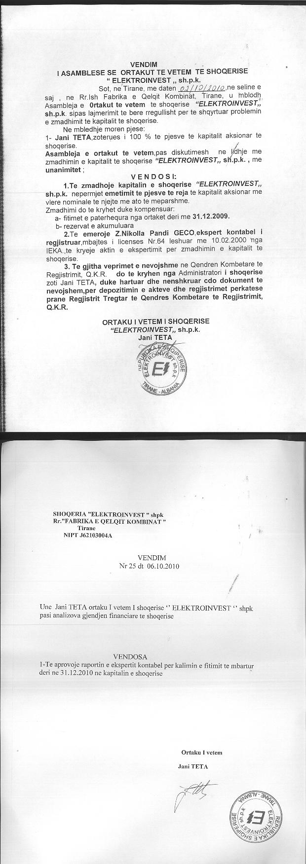 → Ekstrakt historik i regjistrit tregtar date 03.08.2021 → Akti i themelimit dhe statuti → Kontrate shitje kuotash kapitali date 26.09.2001 → Vendimi i asamblese se ortakut te vetem per zmadhimin e kapitalit date 02.10.2010 → Vendimi i ortakut te vetem per zmadhimin e kapitalit date 20.11.2014 → Vendimi i ortakut te vetem per zmadhimin e kapitalit date 25.08.2008 |