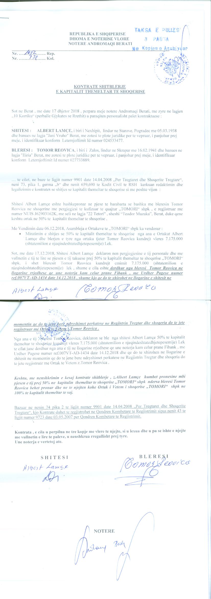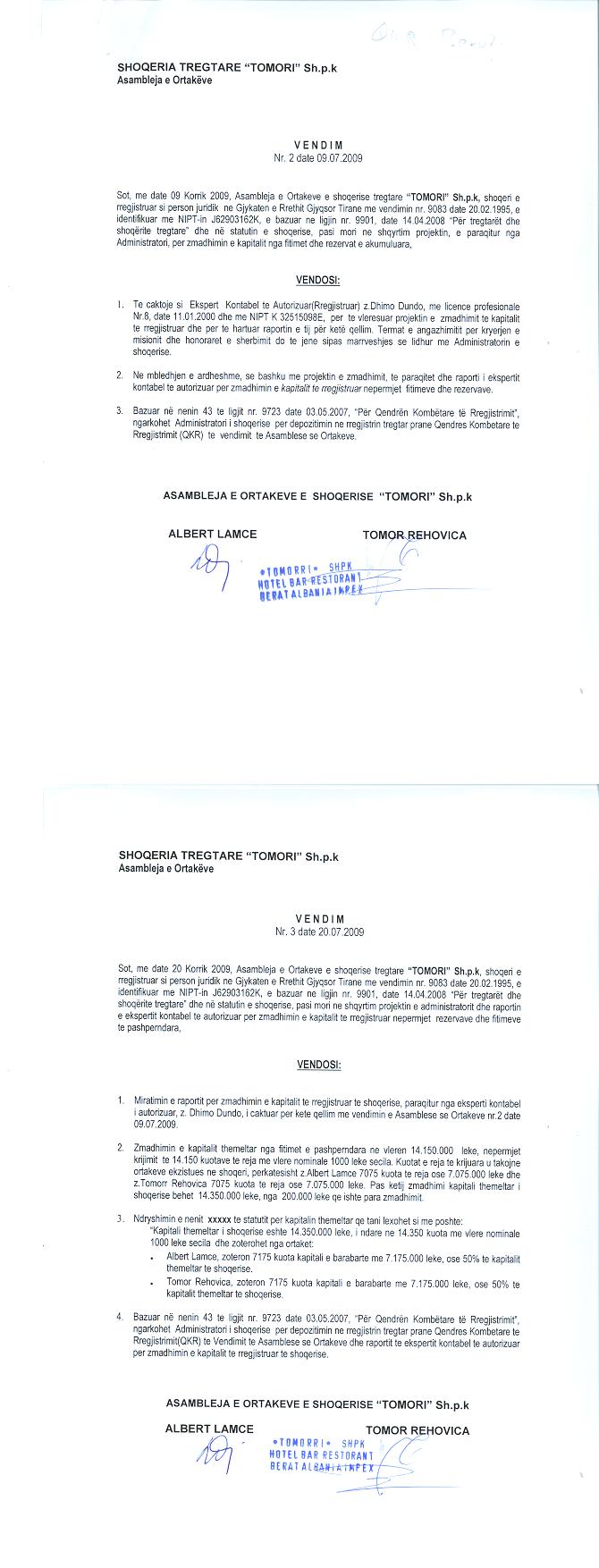 → Ekstrakti Historik i Regjistrit Tregtar date 18.11.2021 → Vendimi per zmadhimin e kapitalit 20.07.2009 → Kontrate shitblerje e kapitalit 17.12.2018 → Akti i themelimit dhe Statuti |