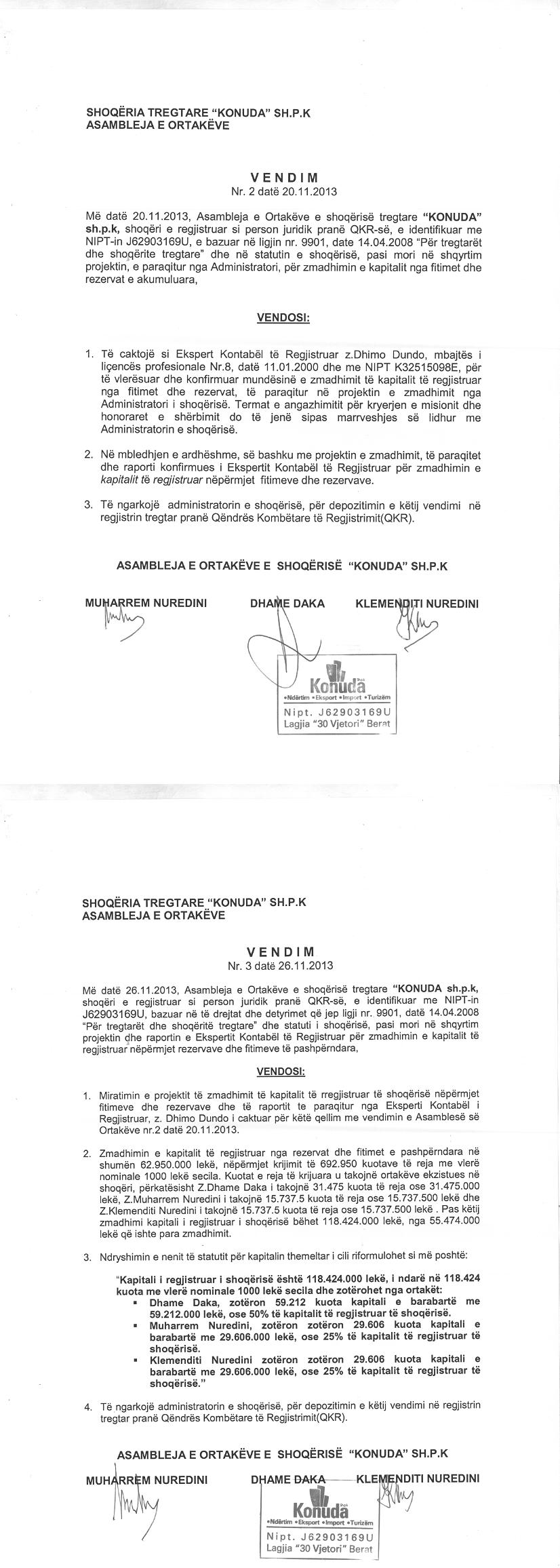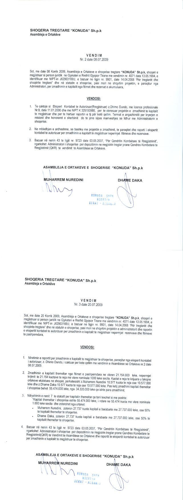 → Ekstrakt Historik i Regjistrit Tregtar date 05.06.2024 → Kontratë për Krijimin e Shoqërisë → Statuti i Shoqerise → Dokumente të Ndryshme → Kontratë Shitje datë 27.02.2002 → Vendim i Asamblesë së Jashtëzakonshme, Zmadhim Kapitali datë 10.06.2005 → Vendim i Asamblesë së Ortakëve, Zmadhim Kapitali datë 20.07.2009 → Kontratë Shitblerje Kuotash Kapitali Themeltar datë 06.10.2011 → Vendim i Asamblesë së Ortakëve, Zmadhim Kapitali datë 26.11.2013 |