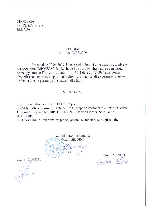 | Çështje Ligjore: | Me date 02.06.2009, me vendim te asamblese se ortakeve, u vendos: Likujdimi i Shoqerise. Statusi i Shoqerise kalon nga "Aktiv" ne "Shoqeri ne Likuidim e Siper" |