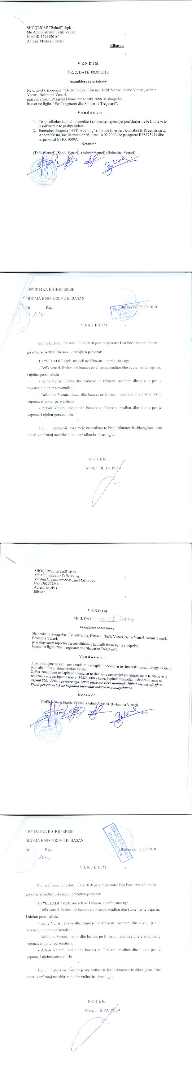 → Ekstrakt historik i regjistrit tregtar 03.03.2021 → Akti i themelimit → Kontrate shitblerje aksionesh 11.09.2006 → Vendimi i asamblese se ortakeve per zmadhimin e kapitalit 08.07.2010 |