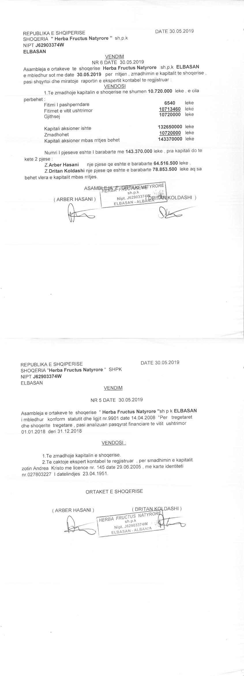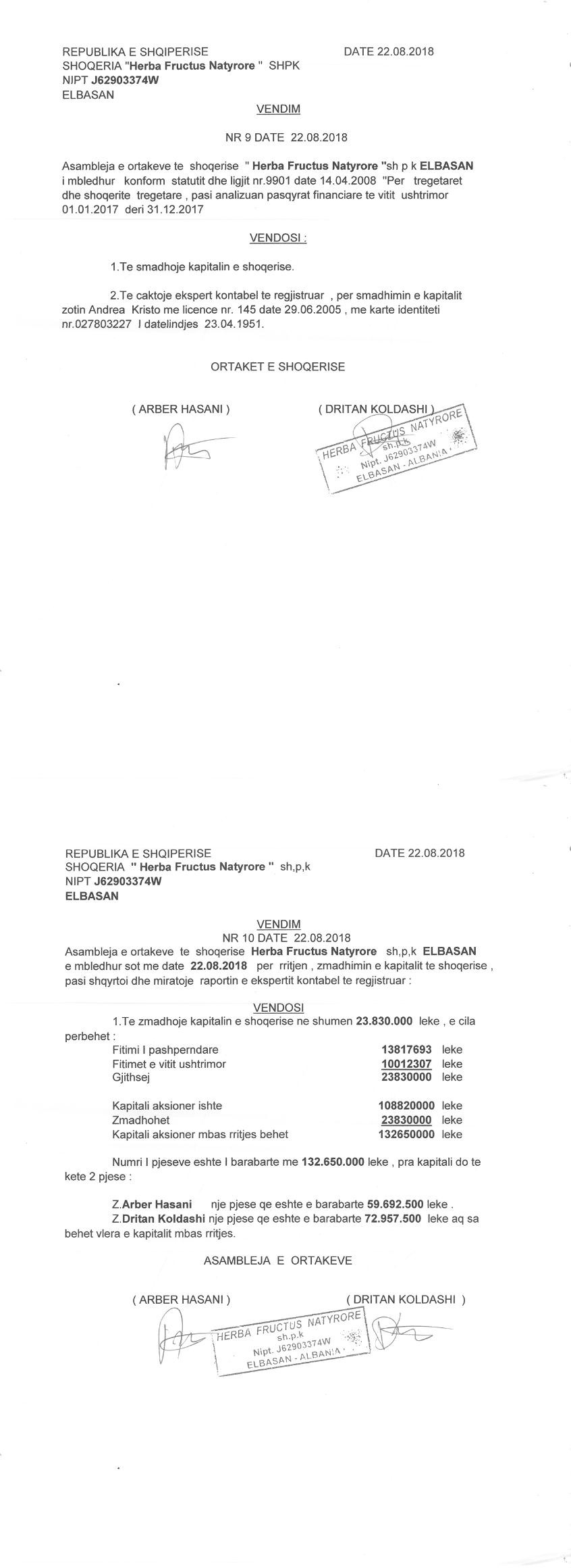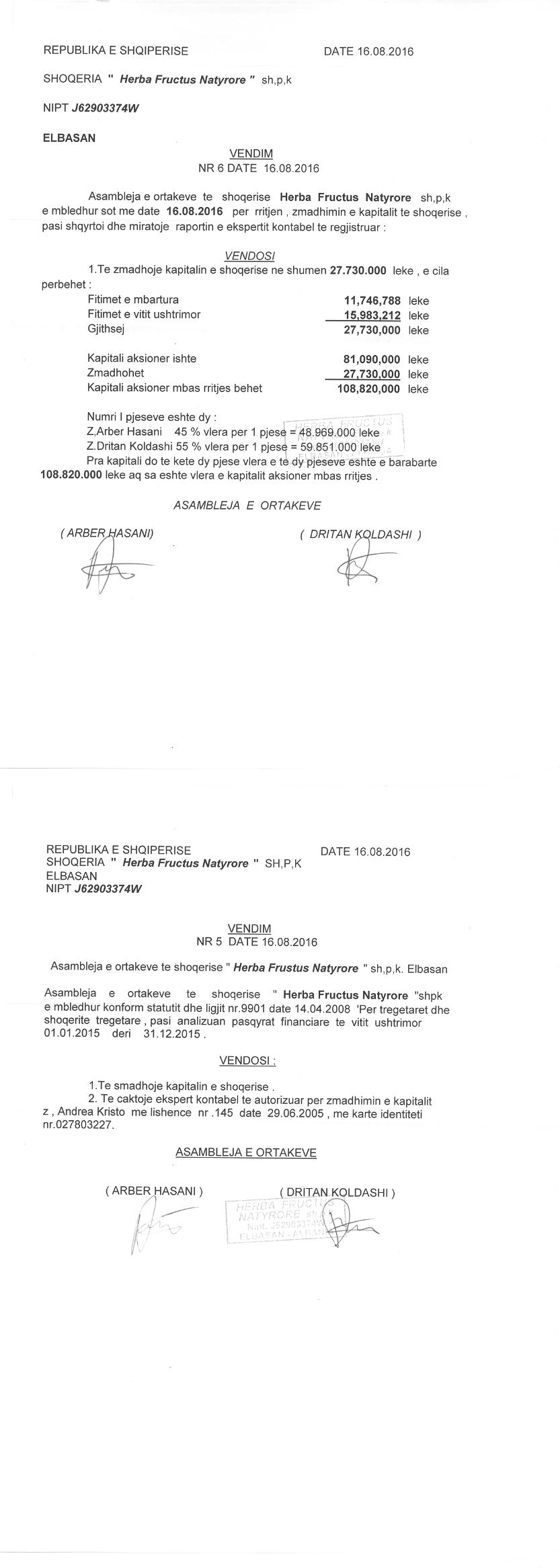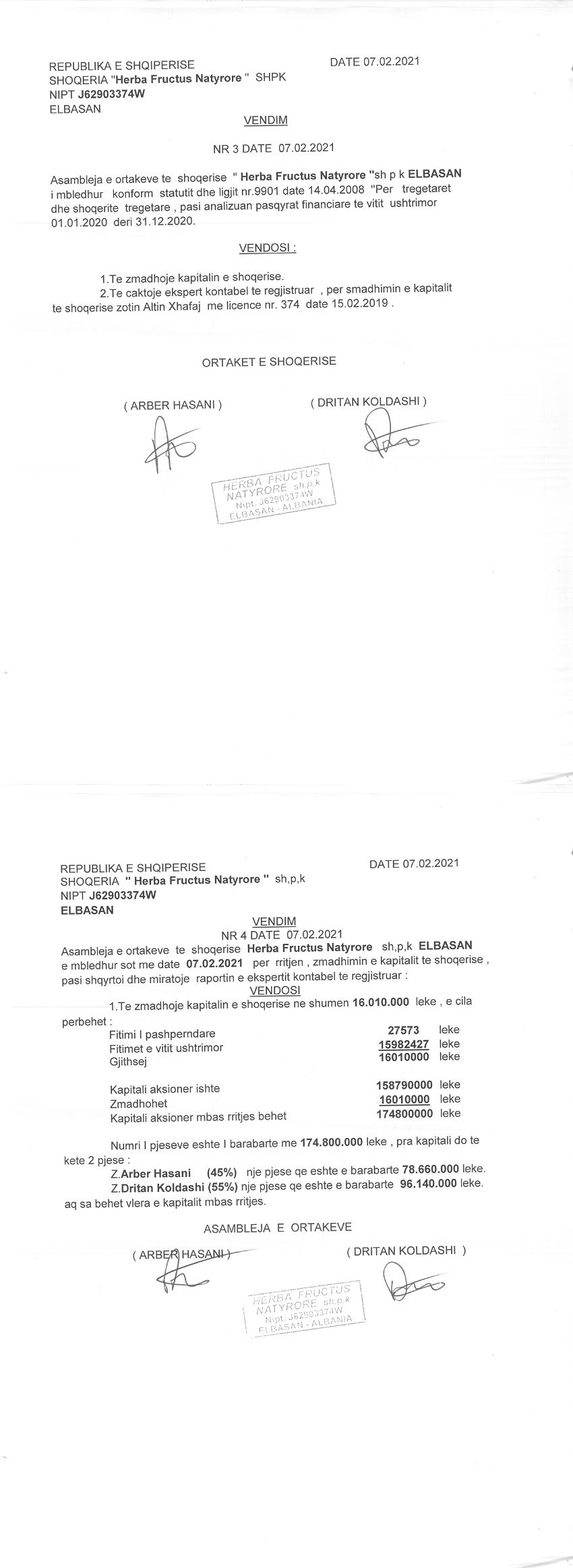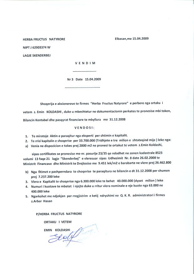 → Ekstrakt Historik i Regjistrit Tregtar date 12.10.2023 → Akt themelimi dhe Statuti i Shoqerise → Dokuemente të Ndryshme → Vendim i Ortakut të Vetëm, Zmadhim Kapitali datë 07.07.2005 → Vendim i Ortakut të Vetëm, Zmadhim Kapitali datë 15.04.2009 → Vendim Dëshmie e Trashëgimisë datë 09.09.2011 → Kontratë Dhurimi Kuotash Kapitali Themeltar datë 06.10.2011 → Vendim i Asamblesë së Ortakëve, Zmadhim Kapitali datë 05.09.2012 → Kontratë Shitblerje Kuotash Kapitali Themeltar datë 15.11.2013 → Vendim i Asamblesë së Ortakëve, Zmadhim Kapitali datë 09.12.2014 → Kontratë Shitblerje Kuotash Kapitali Themeltar datë 04.05.2015 → Vendim i Asamblesë së Ortakëve, Zmadhim Kapitali datë 16.08.2016 → Vendim i Asamblesë së Ortakëve, Zmadhim Kapitali datë 22.08.2018 → Vendim i Asamblesë së Ortakëve, Zmadhim Kapitali datë 30.05.2019 → Vendim i Asamblesë së Ortakëve, Zmadhim Kapitali datë 04.03.2020 → Vendim i Asamblesë së Ortakëve, Zmadhim Kapitali datë 07.02.2021 → Vendim i Asamblesë së Ortakëve, Zmadhim Kapitali datë 25.07.2022 → Kontratë Dhurimi Kuotash Kapitali datë 11.01.2023 → Ekstrakt Historik i Regjistrit Tregtar date 17.04.2024 → Kontratë Dhurimi Kuotash Kapitali datë 18.11.2023 → Të dhënat e Investimit, Financimet Nga IPARD - Aksesuar nga Agjencia për Zhvillim Bujqësor dhe Rural AZHBR datë 17.04.2024 |