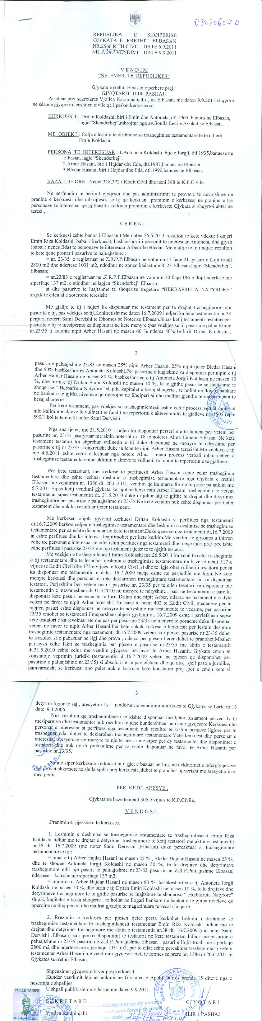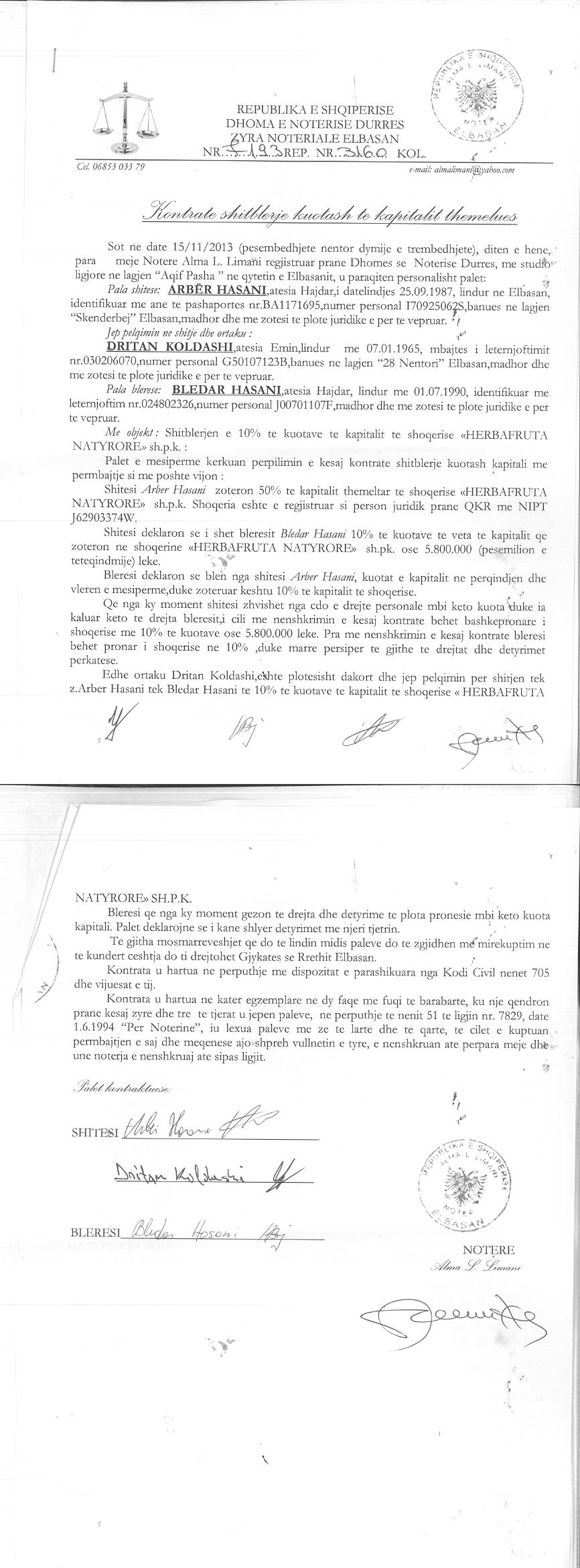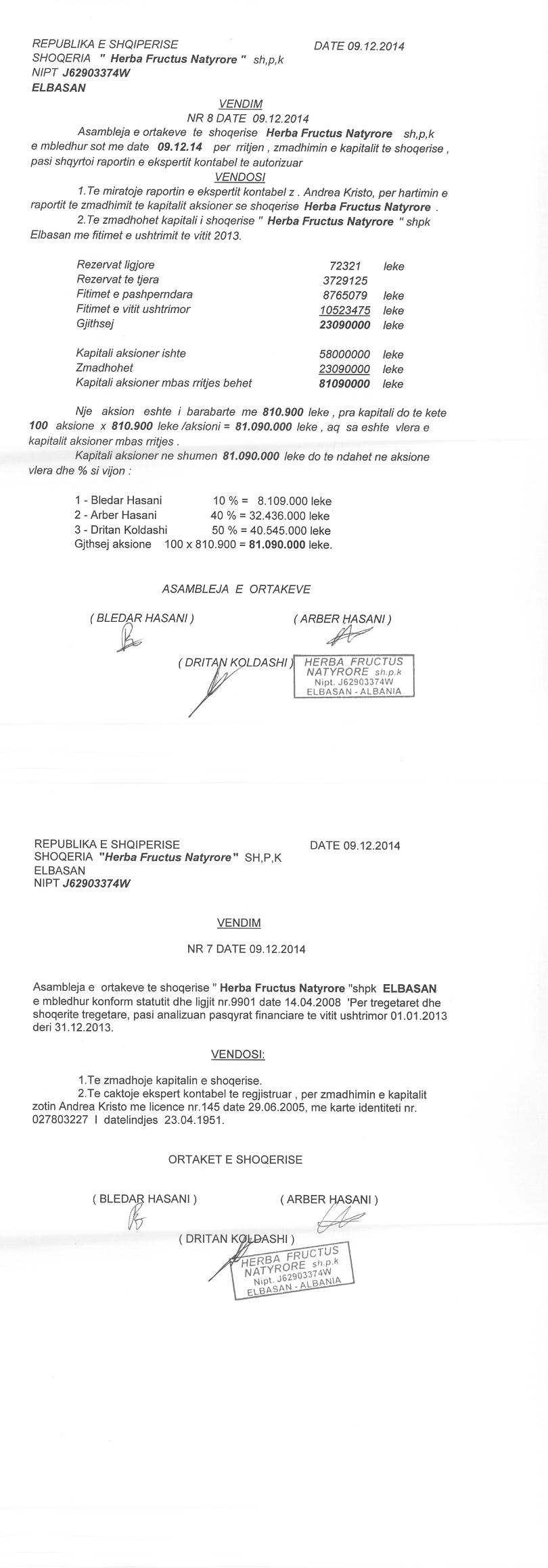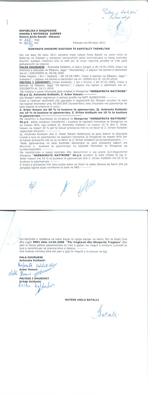 → Ekstrakt Historik i Regjistrit Tregtar date 12.10.2023 → Akt themelimi dhe Statuti i Shoqerise → Dokuemente të Ndryshme → Vendim i Ortakut të Vetëm, Zmadhim Kapitali datë 07.07.2005 → Vendim i Ortakut të Vetëm, Zmadhim Kapitali datë 15.04.2009 → Vendim Dëshmie e Trashëgimisë datë 09.09.2011 → Kontratë Dhurimi Kuotash Kapitali Themeltar datë 06.10.2011 → Vendim i Asamblesë së Ortakëve, Zmadhim Kapitali datë 05.09.2012 → Kontratë Shitblerje Kuotash Kapitali Themeltar datë 15.11.2013 → Vendim i Asamblesë së Ortakëve, Zmadhim Kapitali datë 09.12.2014 → Kontratë Shitblerje Kuotash Kapitali Themeltar datë 04.05.2015 → Vendim i Asamblesë së Ortakëve, Zmadhim Kapitali datë 16.08.2016 → Vendim i Asamblesë së Ortakëve, Zmadhim Kapitali datë 22.08.2018 → Vendim i Asamblesë së Ortakëve, Zmadhim Kapitali datë 30.05.2019 → Vendim i Asamblesë së Ortakëve, Zmadhim Kapitali datë 04.03.2020 → Vendim i Asamblesë së Ortakëve, Zmadhim Kapitali datë 07.02.2021 → Vendim i Asamblesë së Ortakëve, Zmadhim Kapitali datë 25.07.2022 → Kontratë Dhurimi Kuotash Kapitali datë 11.01.2023 → Ekstrakt Historik i Regjistrit Tregtar date 17.04.2024 → Kontratë Dhurimi Kuotash Kapitali datë 18.11.2023 → Të dhënat e Investimit, Financimet Nga IPARD - Aksesuar nga Agjencia për Zhvillim Bujqësor dhe Rural AZHBR datë 17.04.2024 |