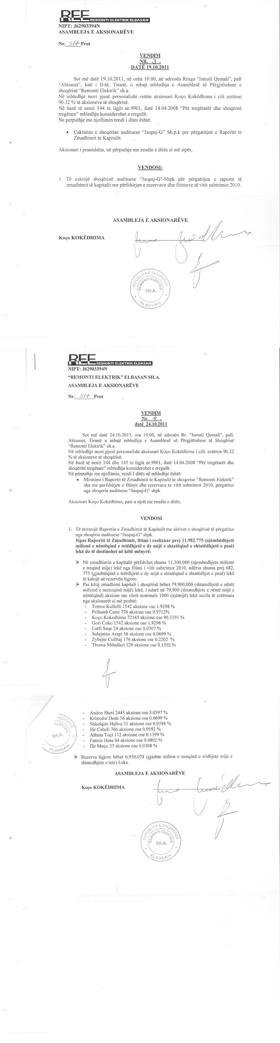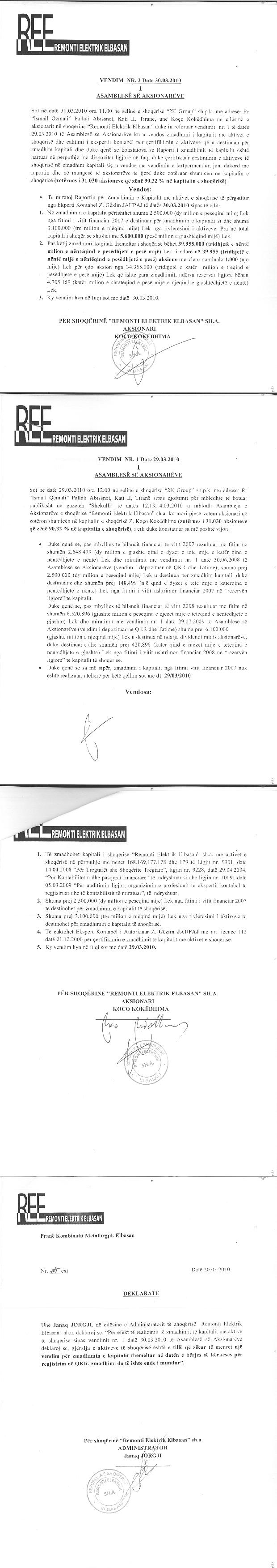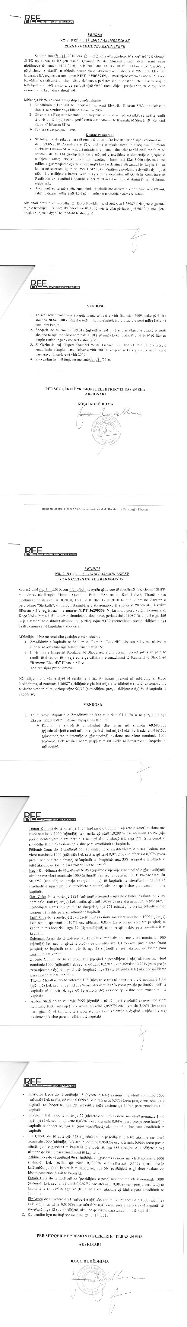 → Ekstrakt historik i regjistrit tregtar date 23.09.2021 → Akti i themelimit dhe statuti → Vendim per Leshimin e Deshmise se Trashegimise date 25.11.2004 → Konrate shit-blerje aksionesh date 11.09.2013 → Deshmi trashegimie testamentare date 24.11.2017 → Kontrate shit-blerje aksionesh date 27.03.2016 → Kontrate shit-blerje aksionesh date 12.06.2018 → Kontrate shitblerje aksionesh date 17.04.2013 → Urdher Nr.1/11 date 18.08.1995 per shitjen e aksioneve te shoqerise anonime Remonti Elektrik Elbasan → Kontrate shit-blerje aksionesh date 02.05.2018 → Kontrate shit-blerje aksionesh date 26.03.2018 → Kontrate dhurimi kuotash date 14.11.2017 → Vendimi i asamblese se aksionareve per zmadhimin e kapitalit date 30.03.2010 → Vendimi i asamblese se aksionareve per zmadhimin e kapitalit date 04.11.2010 → Vendimi i asamblese se aksionareve per zmadhimin e kapitalit date 19.10.2011 → Vendimi i asamblese se aksionareve per zmadhimin e kapitalit te shoqerise date 23.10.2017 → Vendimi i asamblese se aksionareve per zmadhimin e kapitalit date 14.11.2016 → Vendimi i asamblese se aksionareve per miratimin e raportit te zmadhimit te kapitalit date 24.11.2014 → Vendimi i asamblese se aksionareve per miratimin e raportit te zmadhimit te kapitalit date 16.11.2012 → Vendimi i asamblese se aksionareve per miratimin e raportit te zmadhimit te kapitalit date 23.09.2013 → Ekstrakti Historik i Regjistrit Tregtar date 11.06.2024 → Akt-Marreveshje date 31.03.2015 → Regjistri i aksioneve te shoqerise |