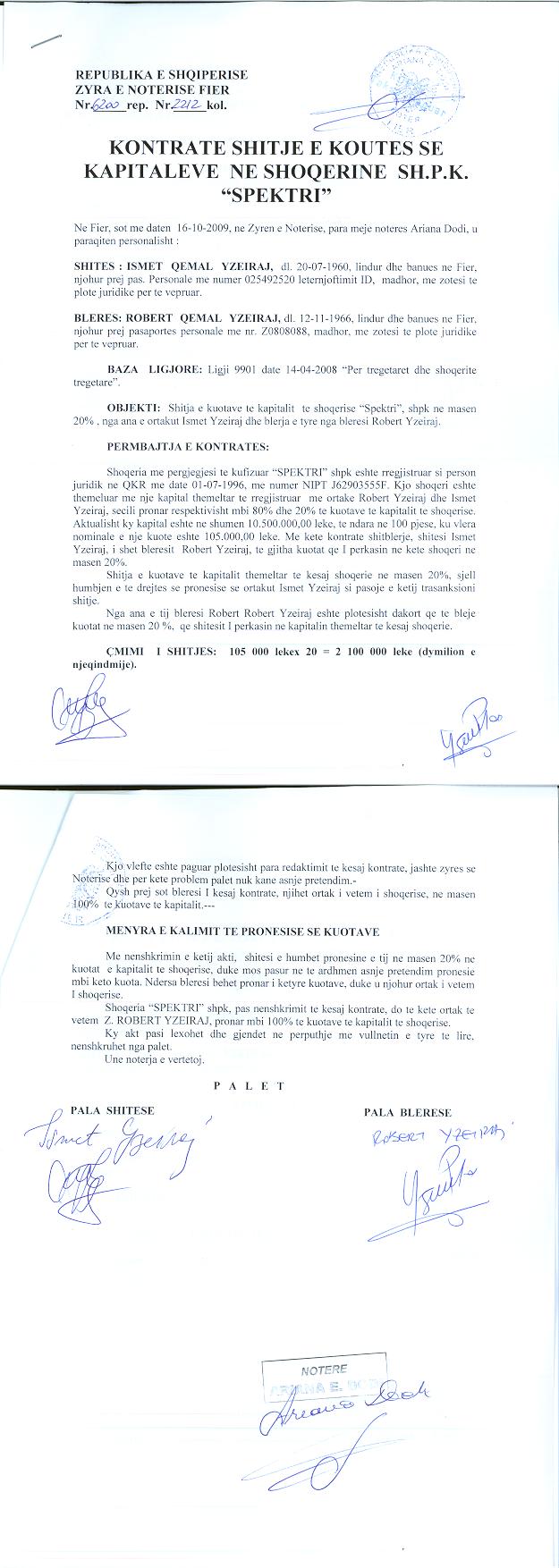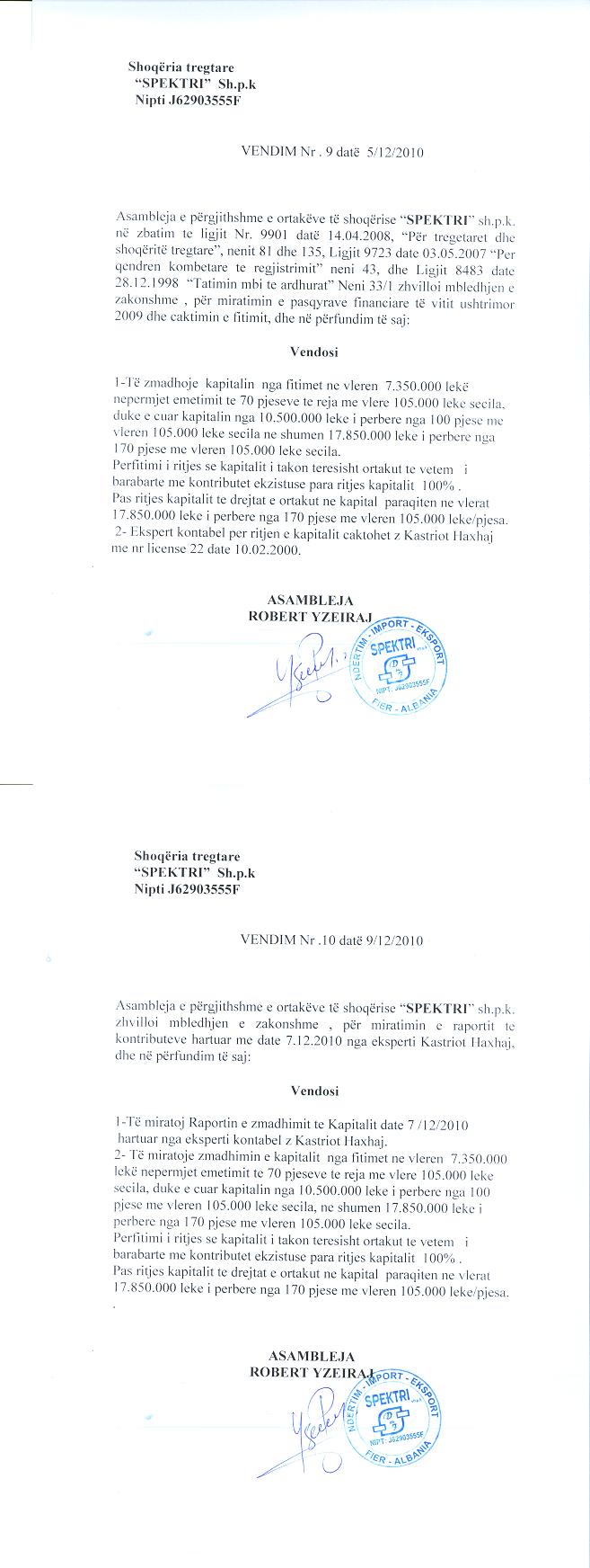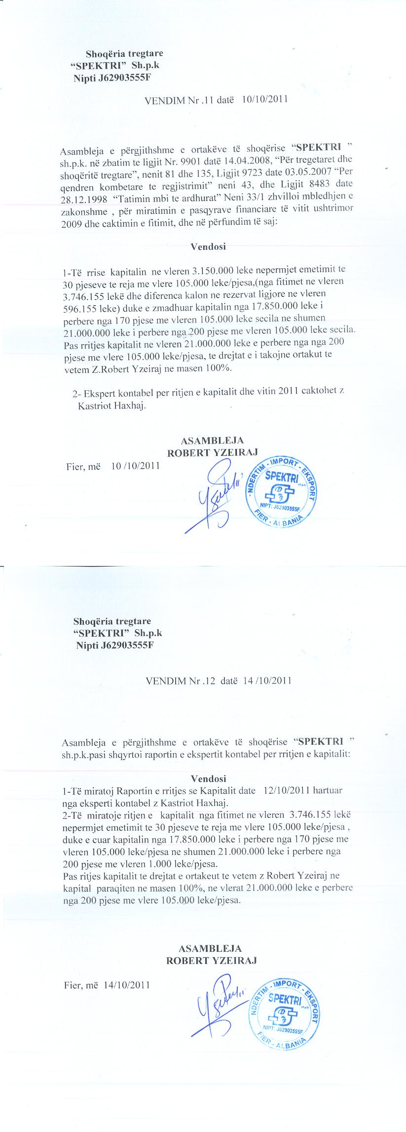 → Ekstrakt historik i regjistrit tregtar 10.03.2021 → Akti i themelimit dhe statuti i shoqerise → Kontrate shitje e kuotes 16.10.2009 → Vendimi per rritjen e kapitalit 10.10.2011 → Vendimi per zmadhimin e kapitalit 05.12.2010 → Ekstrakt historik i regjistrit tregtar date 01.12.2025 → Vendimi i asamblese se ortakeve per zmadhimin e kapitalit date 26.06.2021 → Urdher per venien e sekuestros konservative date 12.04.2024 → Urdher per heqjen e mases se sekuestros date 22.04.2024 |