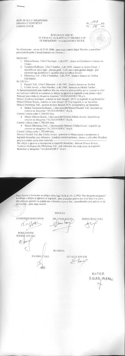 → Ekstrakti Historik i Regjistrit Tregtar date 24.05.2023 → Akt themelimi dhe Statuti i Shoqerise → Kontrate Dhurimi Kuotash date 19.11.2001 → Vendim i Asamblese se Ortakeve, Zmadhim Kapitali date 23.11.2005 → Kontrate Shitje Kuotash date 25.01.2008 |