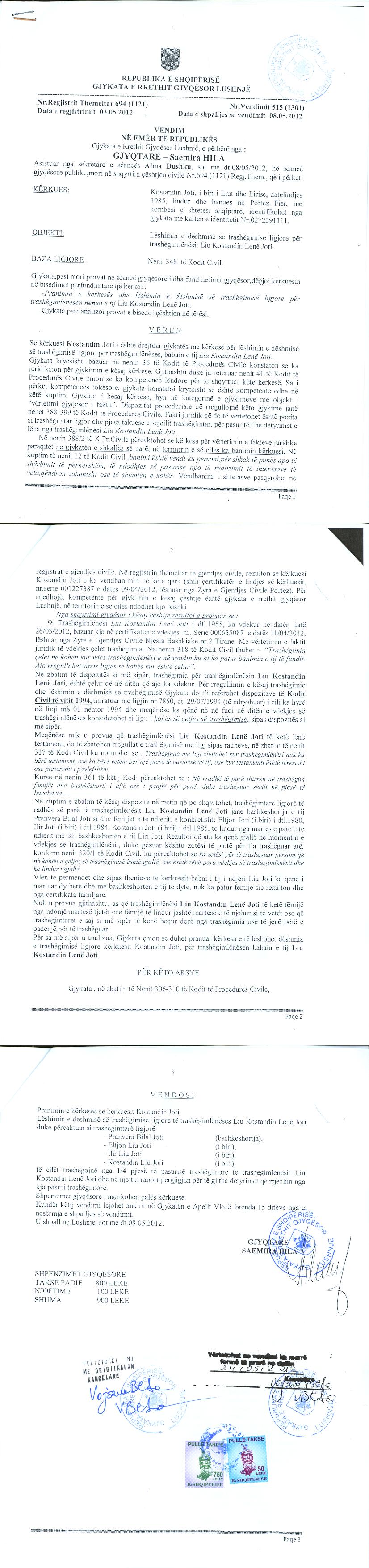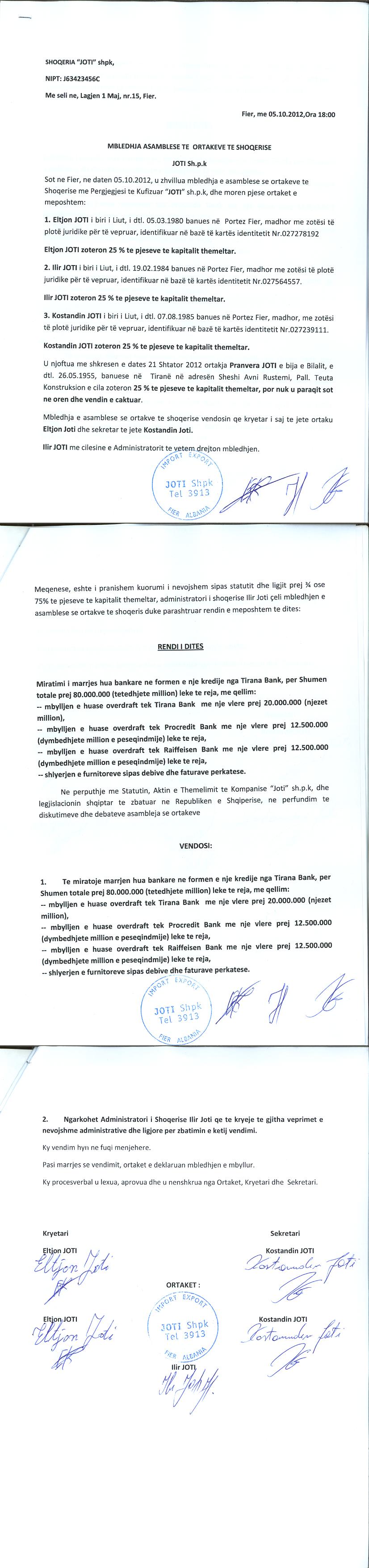 | Çështje Ligjore: | I. Me date 09/10/2012, me ane te vendimit te asamblese se ortakeve date 05.10.2012, u vendos per miratimin e marrjes se nje huaje bankare ne formen e nje kredie nga Tirana Bank per shumen totale prej 80.000.000 (tetedhjete milion) leke te reja. II. Me date 07/12/2017, me ane te Urdherit Nr.31512 Prot, date 22.11.2017 , lëshuar nga shoqeria permbarimore ARB , protokolluar nga QKB me Nr.16834 Prot., datë 04.12.2017, u urdherua vendosja e masës së sekuestros konservative mbi kuotat e shoqerise JOTI shpk me NIPT-J63423456C. III. Me date 20/12/2017, me ane te Shkreses Nr.4/512 Prot, date 12.12.2017, protokolluar nga QKB me Nr.17252 Prot., date 13.12.2017, lëshuar nga shoqeria permbarimore "ARB " sh.p.k, , u urdherua heqja e masës së sekuestros konservative te vendosur me Urdhrin per Venien e Sekuestros Konservative Nr.3/512 Prot., date 22.11.2017. Projekt Bashkimi me Perthithje IV. Me date 22/02/2018, me ane te vendimit te asamblese se ortakeve te shoqerise JOTI shpk date 08.01.2018 per miratimin e bashkimit me perthithje te shoqerise te shoqerise JOTI SHA 2010 sha me shoqerine JOTI shpk, ku shoqeria JOTI shpk do te jete shoqeria perthithese dhe JOTI SHA 2010 sha do te jete shoqeria e perthithur. Miratimi i Bashkimit me Perthithje V. Me date 31/08/2018, me ane te vendimit te asamblese se ortakeve te shoqerise JOTI shpk date 18.07.2018 per miratimin e bashkimit me perthithje te shoqerise JOTI SHA 2010 sha me shoqerine JOTI shpk, ku shoqeria JOTI shpk do te jete shoqeria perthithese dhe JOTI SHA 2010 sha do te jete shoqeria e perthithur, miratimin e projektmarreveshjes dhe raportit te ekspertit pas bashkimit. |