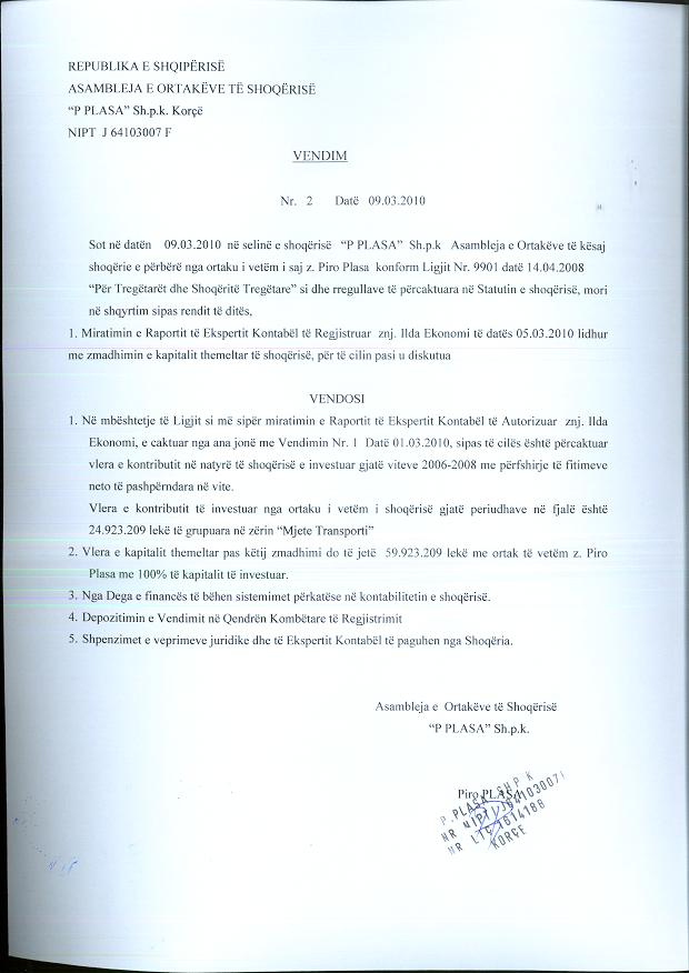 → Ekstrakt historik i regjistrit tregtar date 01.12.2021 → Vendimi i asamblese se ortakeve per zmadhimin e kapitalit date 09.03.2010 |