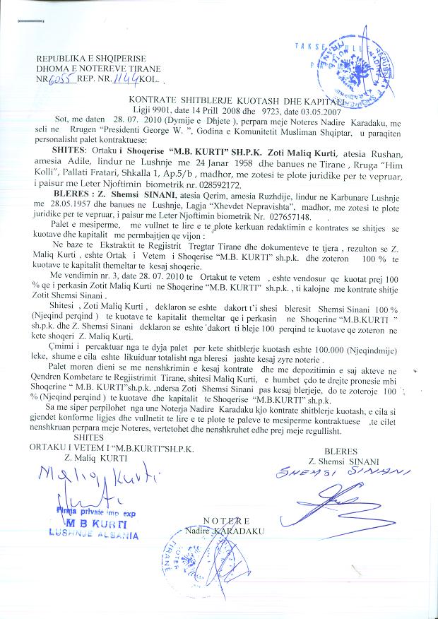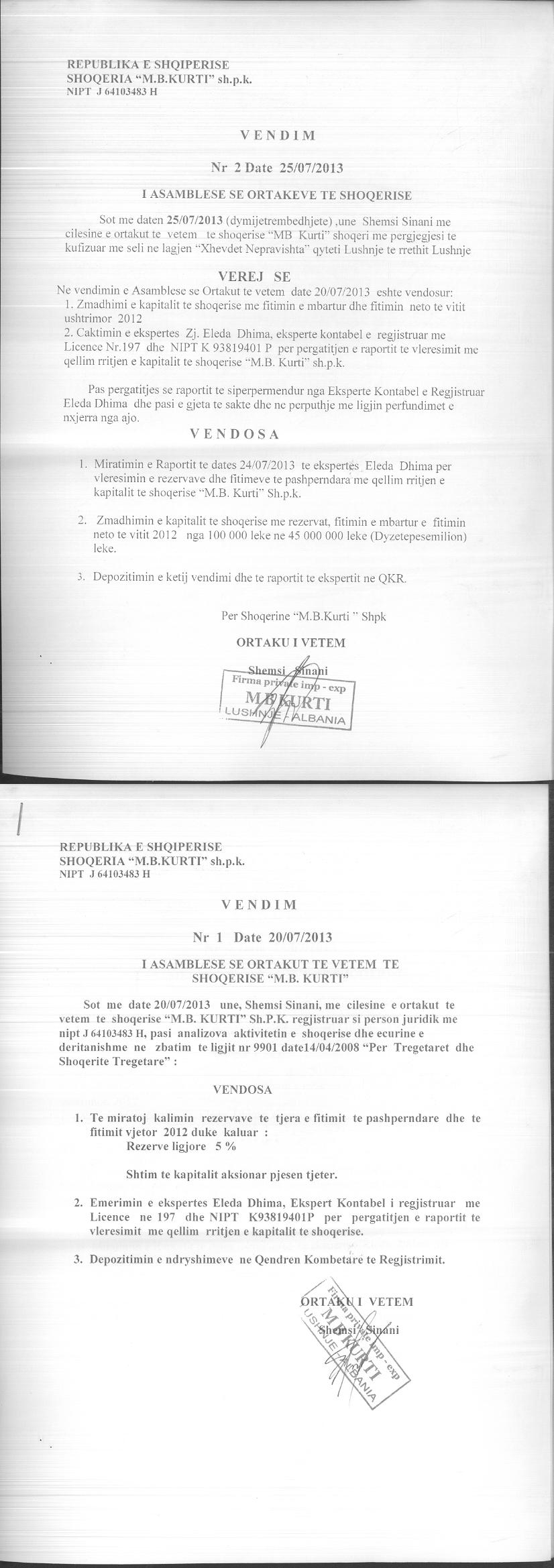 → Ekstrakt historik I regjistrit tregtar 07.06.2022 → Akti I themelimit 2014 → Kontrate shiblerje kuotash 28.07.2010 → Vendim I asamblese per rritje kapitali 25.07.2013 → Kontrate dy paleshe dhurimi 14.01.2019 → Ekstrakt Historik i Regjistrit Tregtar date 15.05.2025 |