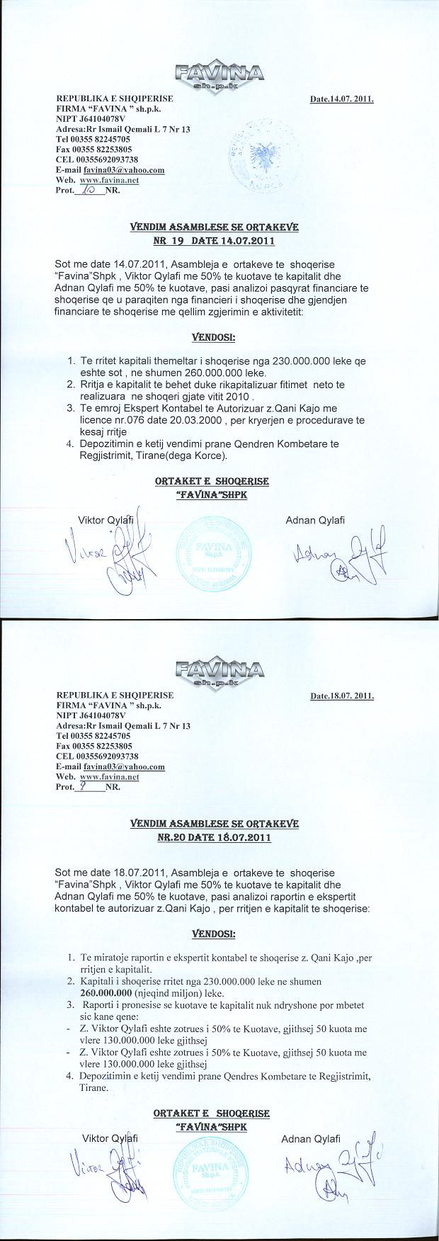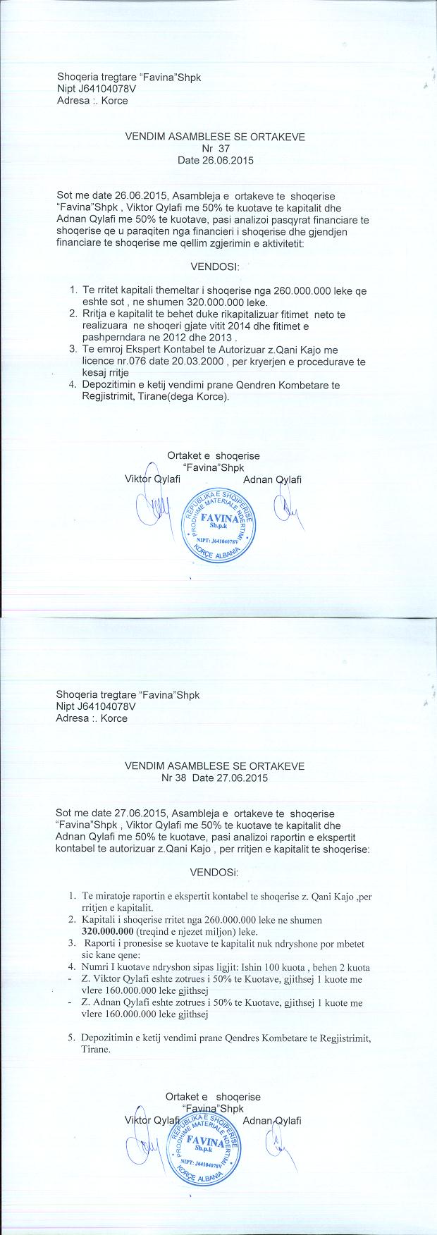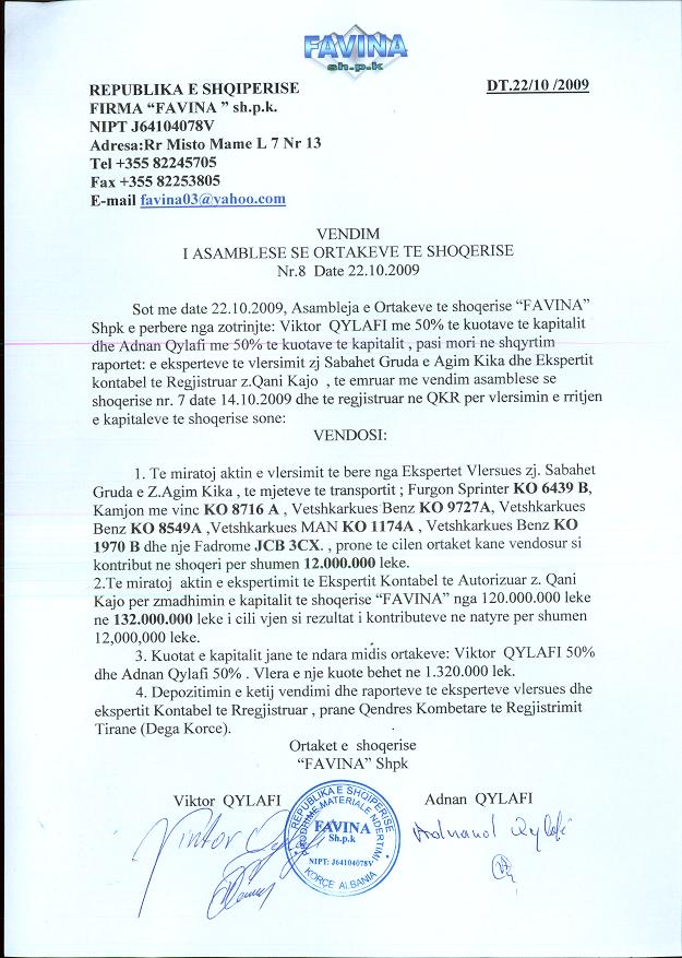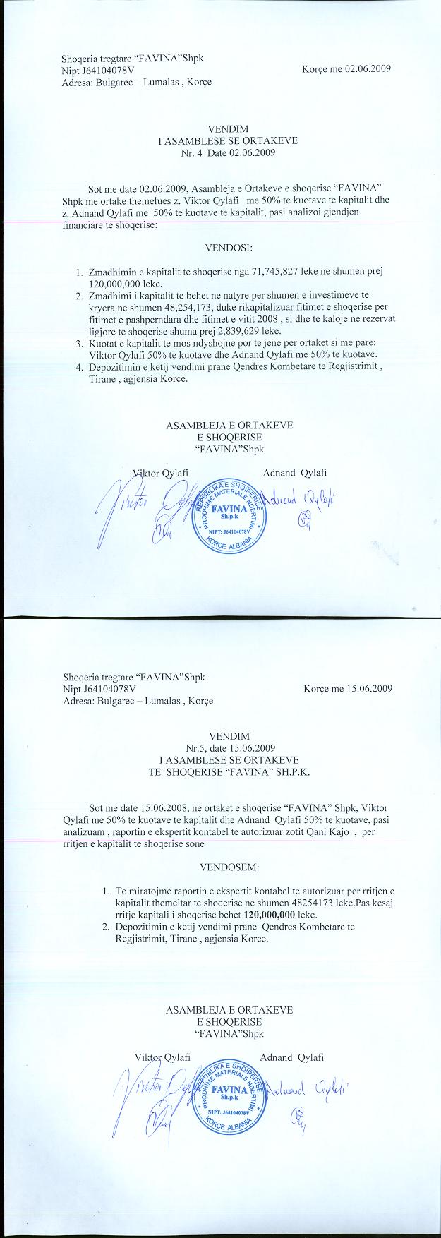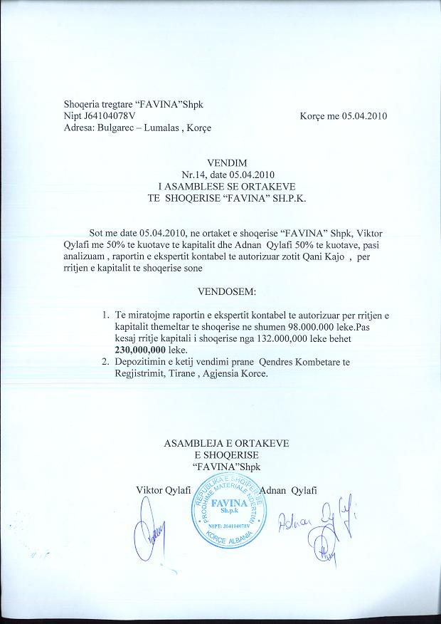 → Ekstrakti Historik i Regjistrit Tregtar date 07.01.2022 → Statuti i shoqerise dhe dokumenta te ndryshem → Vendim i asamblese se ortakeve date 02.06.2009 → Vendim i asamblese se ortakeve date 22.10.2009 → Vendim i asamblese se ortakeve date 05.04.2010 → Vendim i asamblese se ortakeve date 14.07.2011 → Vendim i asamblese se ortakeve date 26.06.2015 → Vendim i asamblese se ortakeve date 20.06.2021 → Ekstrakti Historik i Regjistrit Tregtar date 16.04.2024 → Ekstrakt Historik i Regjistrit Tregtar date 08.04.2025 |