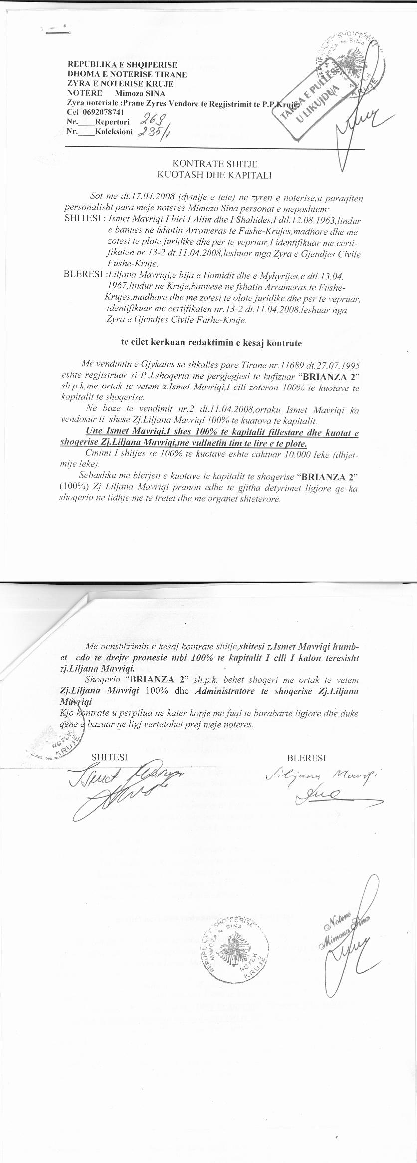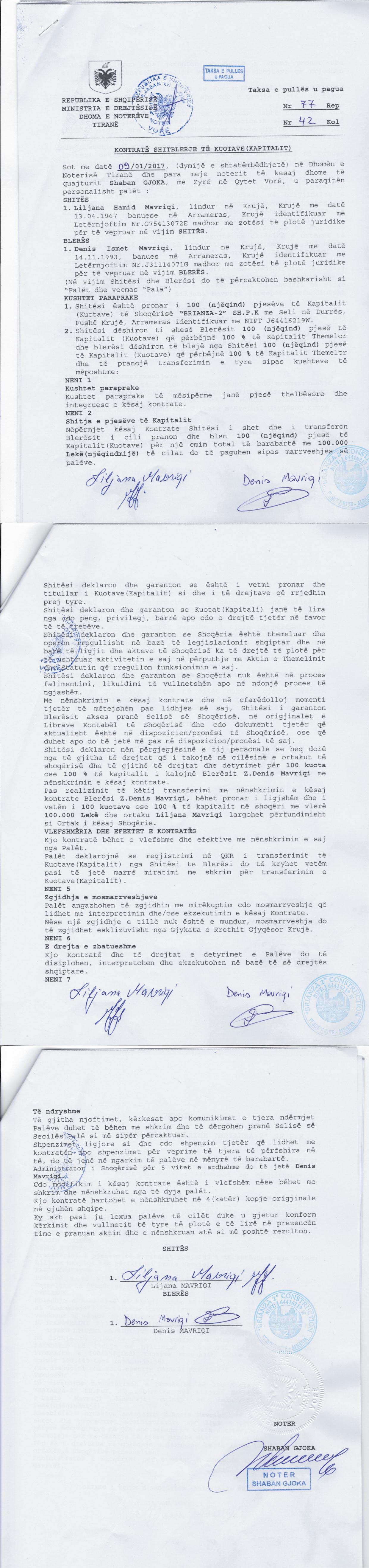 → Ekstrakt historik i regjistrit tregtar date 08.11.2021 → Akti i themelimit → Kontrate shitblerje te kuotave date 09.01.2017 → Kontrate shitje kuotash dhe kapitali date 17.04.2008 |
