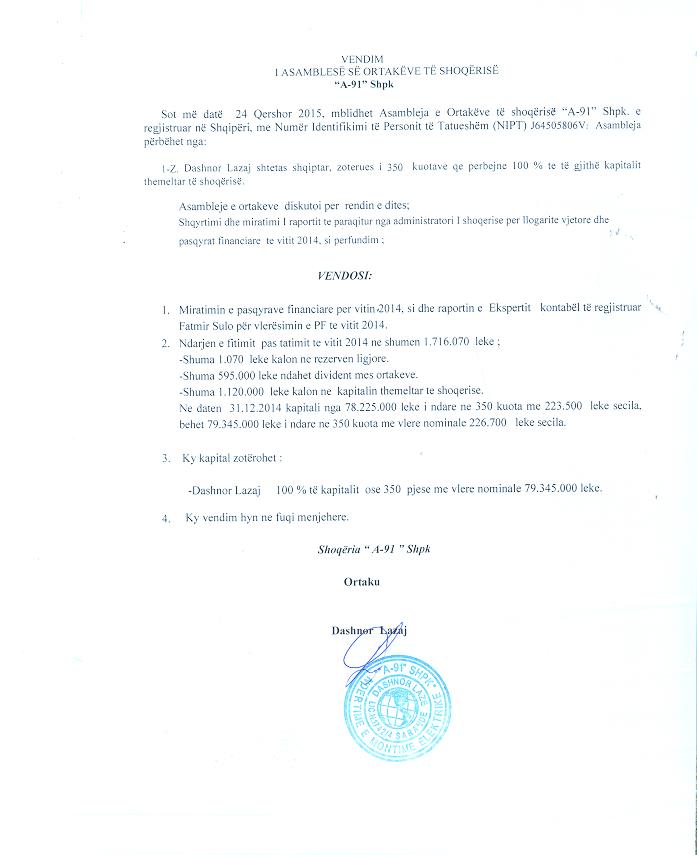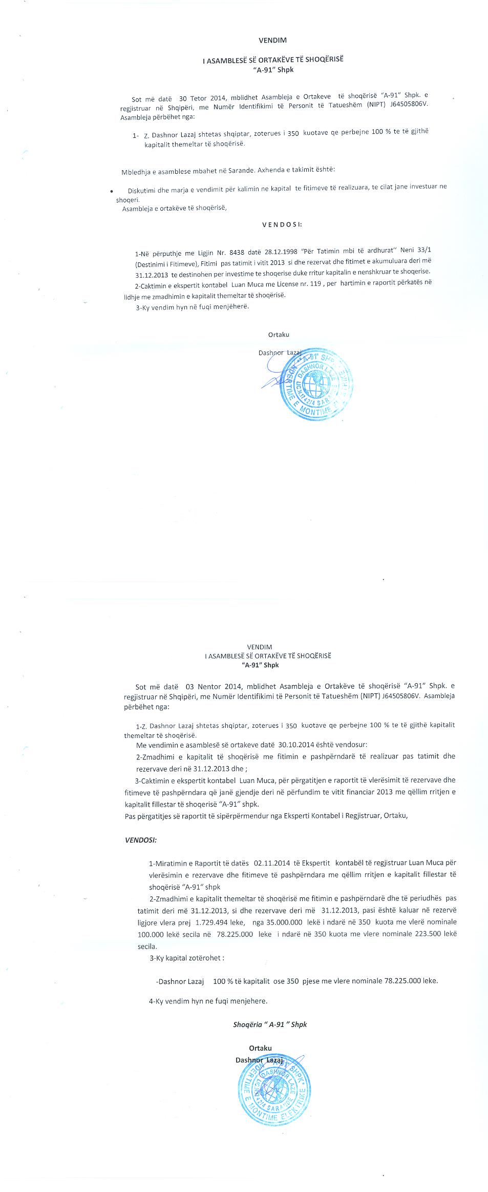 → Ekstrakt historik i regjistrit tregtar 07.04.2021 → Akti i themelimit → Vendimi i asamblese se ortakeve per zmadhimin e kapitalit 30.10.2014 → Vendimi i asamblese se ortakeve per zmadhimin e kapitalit 24.06.2015 → Ekstrakt Historik i Regjistrit Tregtar date 10.06.2025 → Vendimi per zmadhimin e kapitalit date 25.09.2023 |