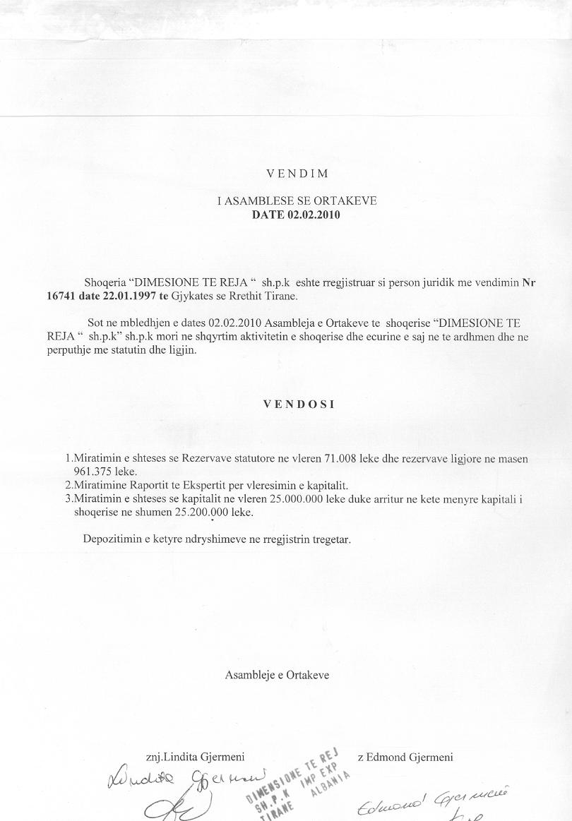 → Ekstrakt Historik i Regjistrit Tregtar date 01.06.2023 → Akt themelimi dhe Statuti i Shoqerise → Raport Bashkimi me Perthithje → Vendim i Ortakut te Vetem, Bashkimi me Perthithje i Shoqerive → Raport i Vecant i Ekspertit, Zmadhim Kapitali date 01.06.2010 → Vendim i Asamblese se Ortakeve, Zmadhim Kapitali date 02.06.2010 |