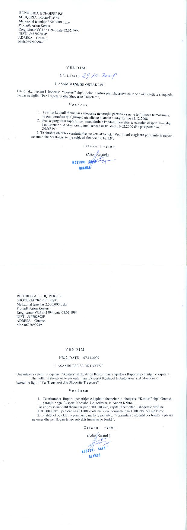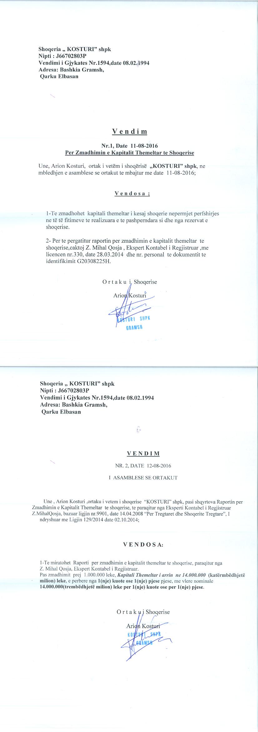 → Ekstrakti Historik I Regjistrit Tregtar date 04.08.2022 → Akt themelimi dhe Statuti i Shoqerise → Kontrate Dhurimi Kuotash date 11.12.2005 → Vendim i Ortakut te Vetem, Zmadhim Kapitali date 07.11.2009 → Vendim i Ortakut te Vetem, Zmadhim Kapitali date 23.12.2014 → Vendim i Ortakut te Vetem, Zmadhim Kapitali date 12.08.2016 |