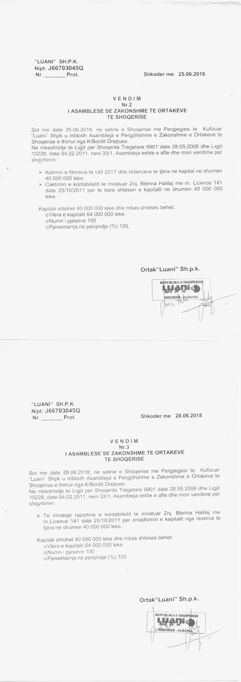 → Ekstrakt Historik i Regjistrit Tregtar date 13.11.2024 → Akt themelimi i Shoqerise → Vendimi per zmadhim kapitali date 21.07.2009 → Vendimi per Zmadhim Kapitali datë 25.06.2018 → Vendimi per Shitje, transferim të Kuotave datë 08.06.2004 → VENDIM NR. 1, DATË 07 / 05 / 2024 PËR MOSPRANIM TË KËRKESËS PËR PËRFITIM TË STATUSIT “INVESTIM/INVESTITOR STRATEGJIK PROCEDURË E VEÇANTË” PËR PROJEKTIN E INVESTIMIT “PLAYA Y MAS- HOTEL DHE RESIDENCA, GOLEM” ME SUBJEKT APLIKUES LUANI SHPK NUIS J66703045Q |