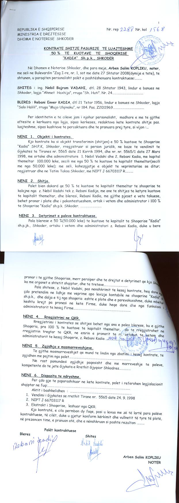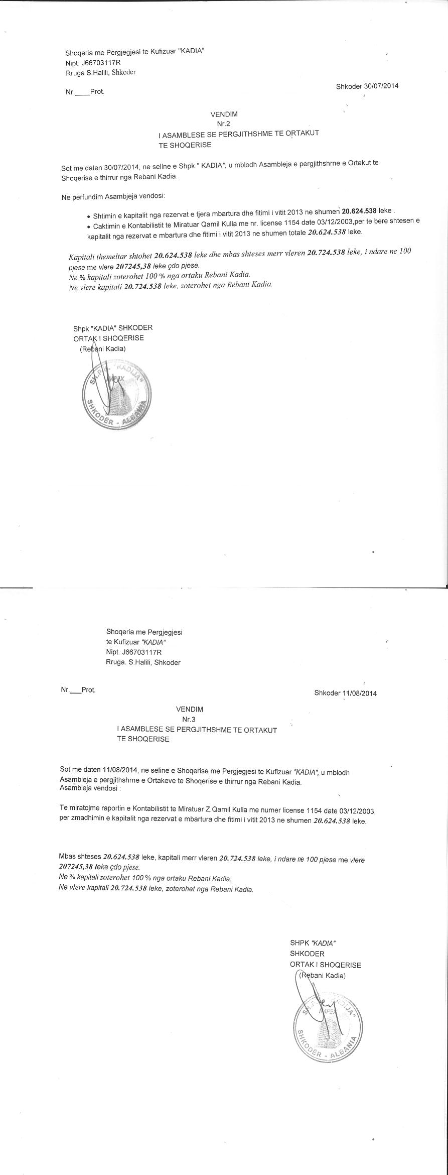 → Ekstrakt historik i regjistrit tregtar 31.05.2021 → Akti i themelimit dhe statuti → Kontrate shitje 26.03.1998 → Kontrate shitje te pasurive te luajtshme 27.09.2008 → Vendim i asamblese se ortakeve per shtimin e kapitalit 30.07.2014 → Ekstrakt historik i regjistrit tregtar date 28.11.2025 |