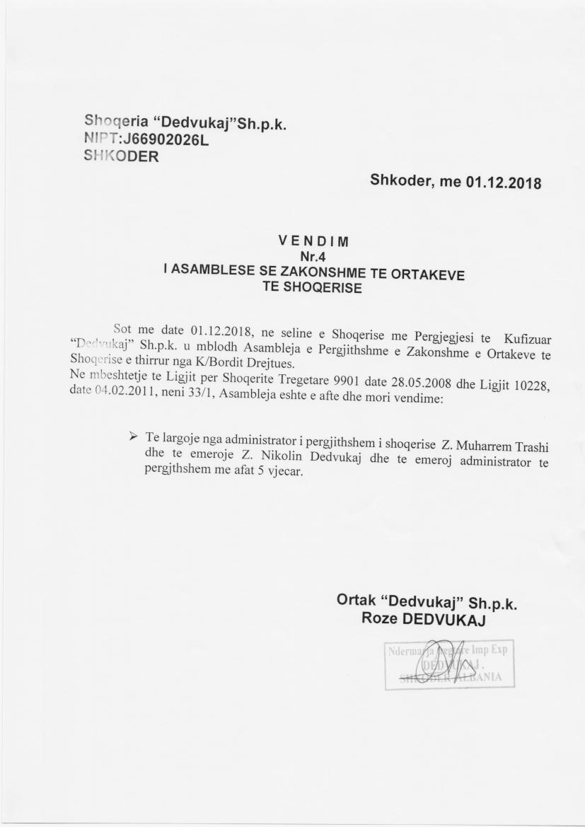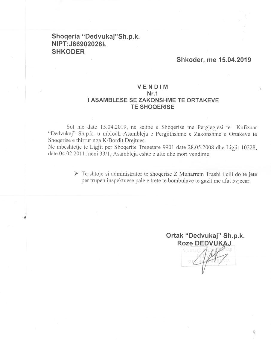→ EKSTRAKT HISTORIK I REGJISTRIT TREGTAR (2018) → Kontrate pengu mbi kuotat e pjesemarrjes ne shoqeri (2013) → Kontrate dhurimi kuotash (2013) → Vendimi i Asamblese se Ortakeve, date 01.12.2018 → Vedimi i asamblese se ortakeve, date 15.04.2019 |