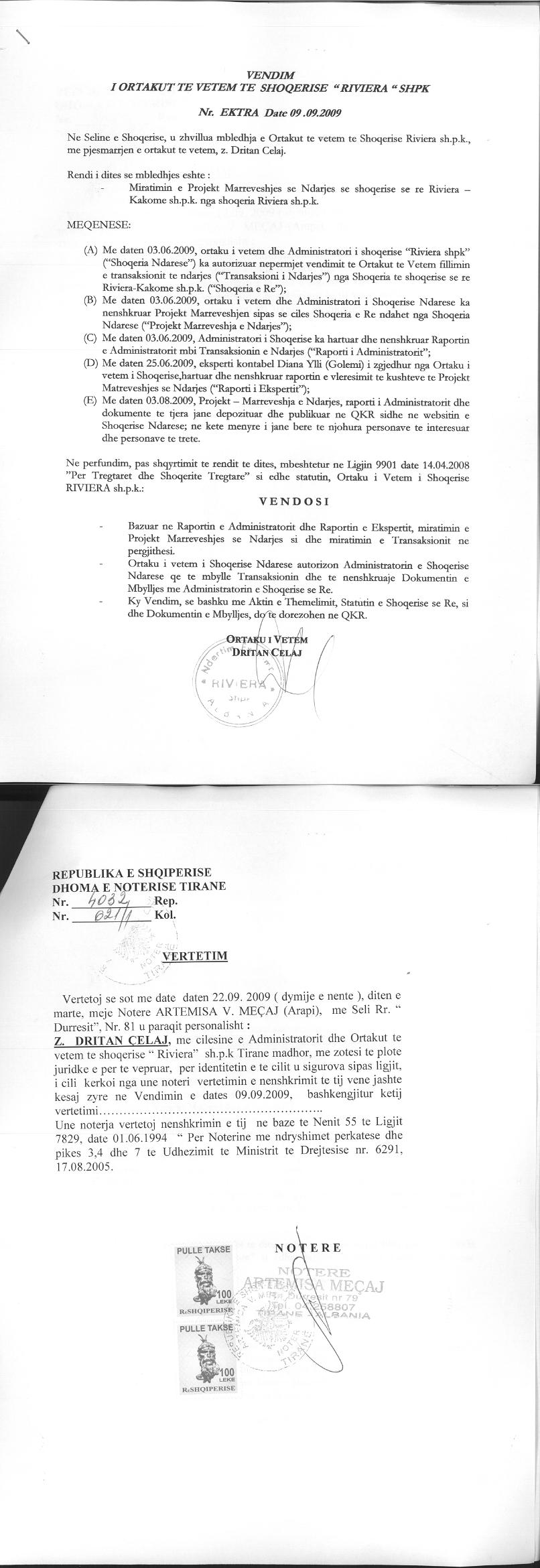 II. Me date 09.09.2009, me vendim te ortakut te vetem, u miratua Projekt Marreveshja e Ndarjes se shoqerise se re Riviera sh.p.k nga shoqeria Riviera sh.p.k. Kapitali i shoqerise eshte 1.000.000 (nje milion) leke.