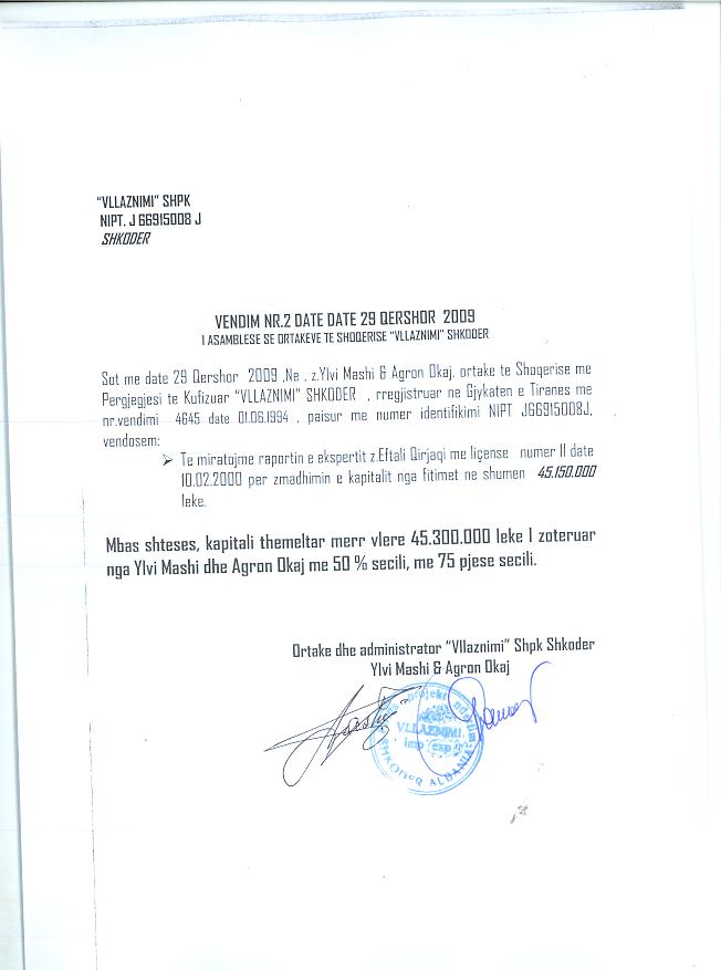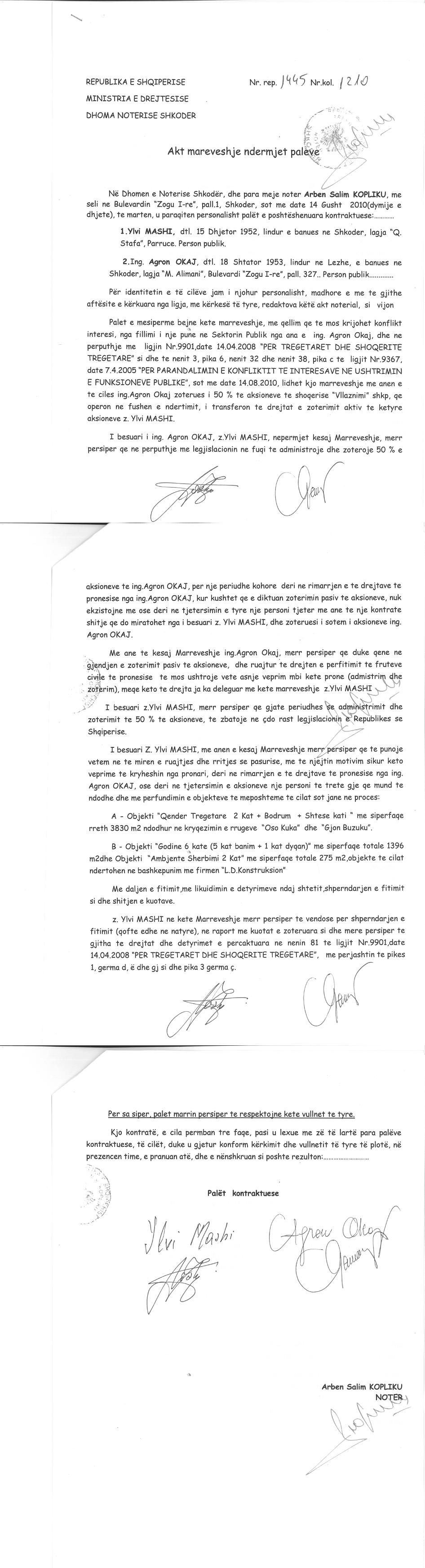 → Ekstrakt historik i regjistrit tregtar 09.09.2020 → Akti I themelimit dhe statuti i shoqerise → Kontrate shit-blerje kuotash 27.09.2006 → Kontrate shitje 21.01.2001 → Vendimi per zmadhimin e kapitalit 29.06.2009 → Akt marreveshje ndermjet paleve per zoterimin pasiv te kuotave 14.08.2010 |