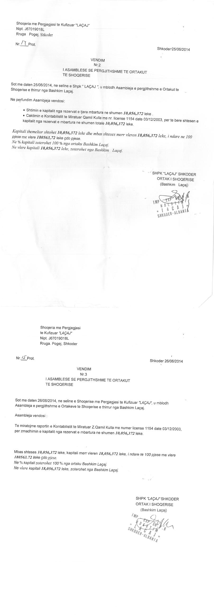 → Ekstrakt historik i regjistrit tregtar 20.06.2022 → Raporti i audituesit per shtesen e kapitalit date 20.05.2008 → Vendimi i ortakut te vetem per zmadhimin e kapitalit date 25.06.2014 → Vendim i asamblese se ortakut per shtimin e kapitalit date 25.09.2018 → Ekstrakt Historik i Regjistrit Tregtar date 14.09.2024 |