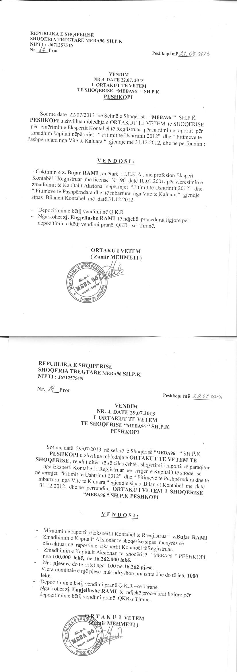 → Ekstrakti Historik i Regjistrit Tregtar date 15.03.2023 → Akt themelimi dhe Statuti i Shoqerise → Kontrate Shitje Kuotash date 20.04.2005 → Vendim i Ortakut te Vetem, Zmadhim Kapitali date 29.07.2013 |
