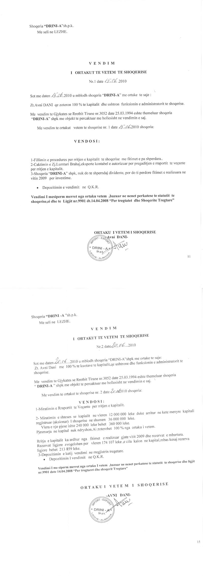 → Ekstrakt historik i regjistrit tregtar 27.04.2021 → Statuti dhe akti i themelimit → Kontrate shitblerje 19.06.2000 → Vendimi i ortakut te vetem per rritjen e kapitalit 15.06.2010 → Vendim i ortakut te vetem per zmadhimin e kapitalit 22.06.2014 |