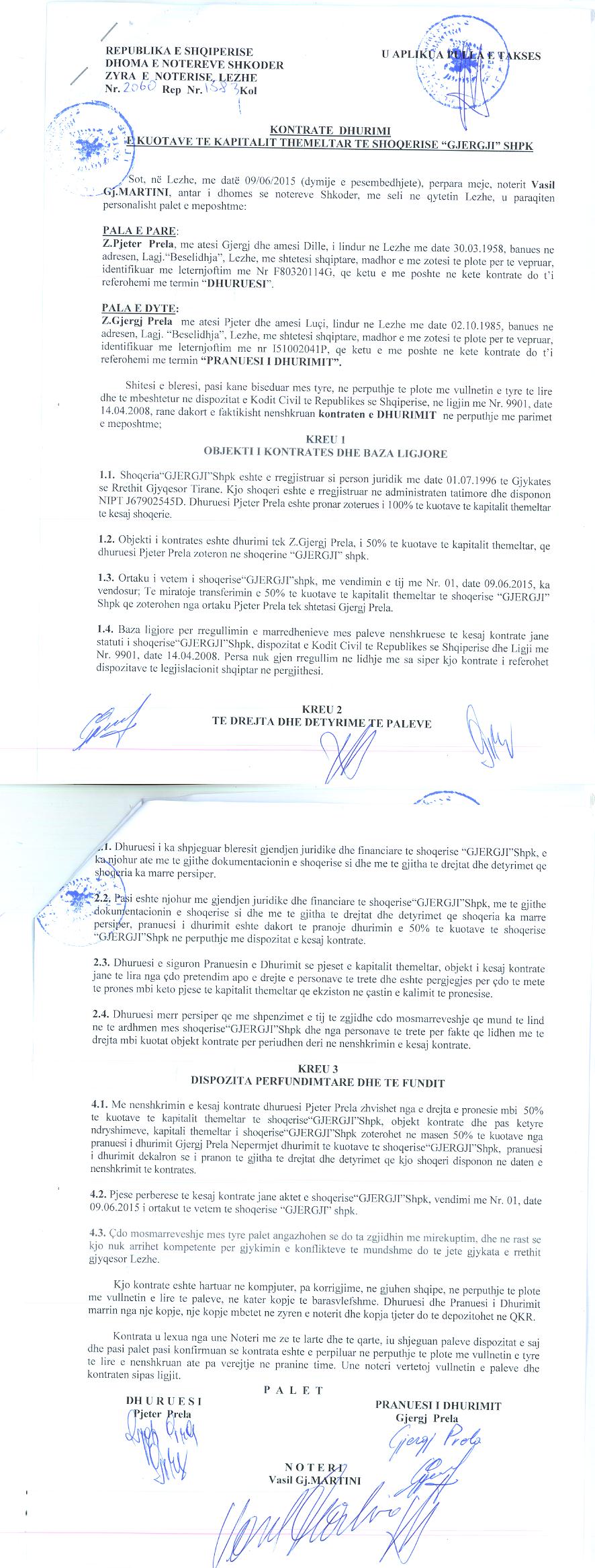 → Ekstrakt historik i regjistrit tregtar date 07.12.2021 → Statuti dhe akti i themelimit → Kontrate dhurimi e kuotave te kapitalit date 09.06.2015 |