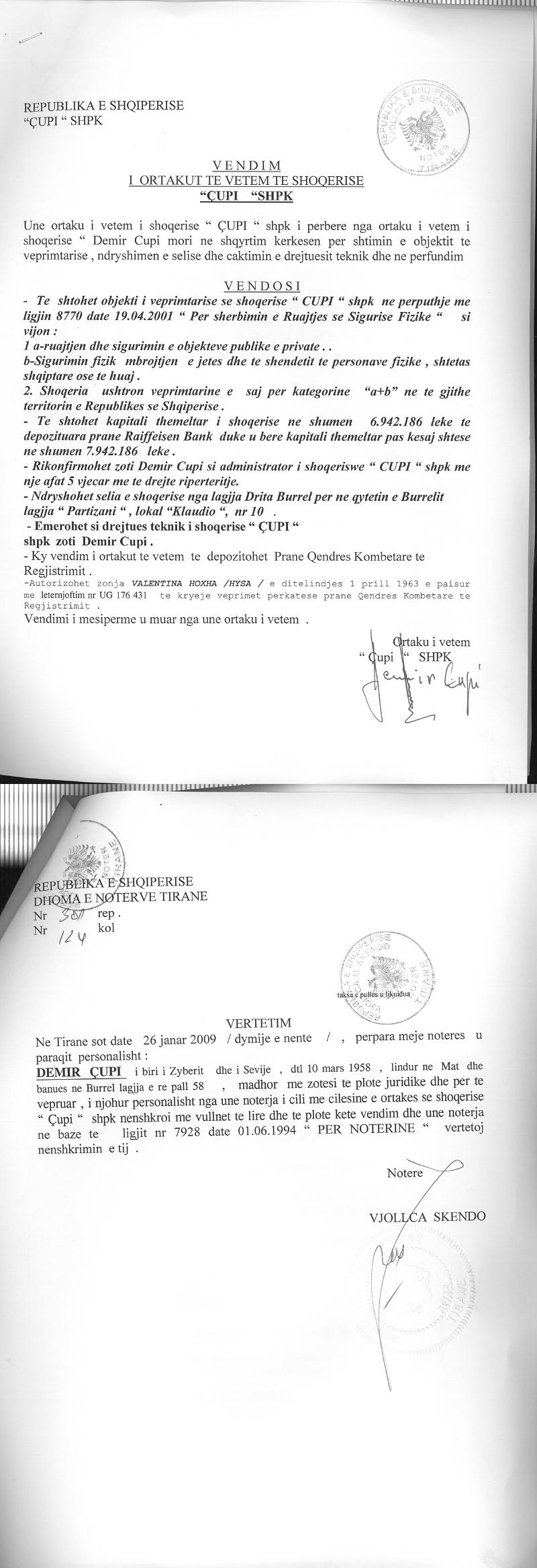 | Shënime: | Me datë 26.01.2009, me vendim të ortakut të vetëm, u emërua Drejtues Teknik i shoqërisë Demir Çupi. |