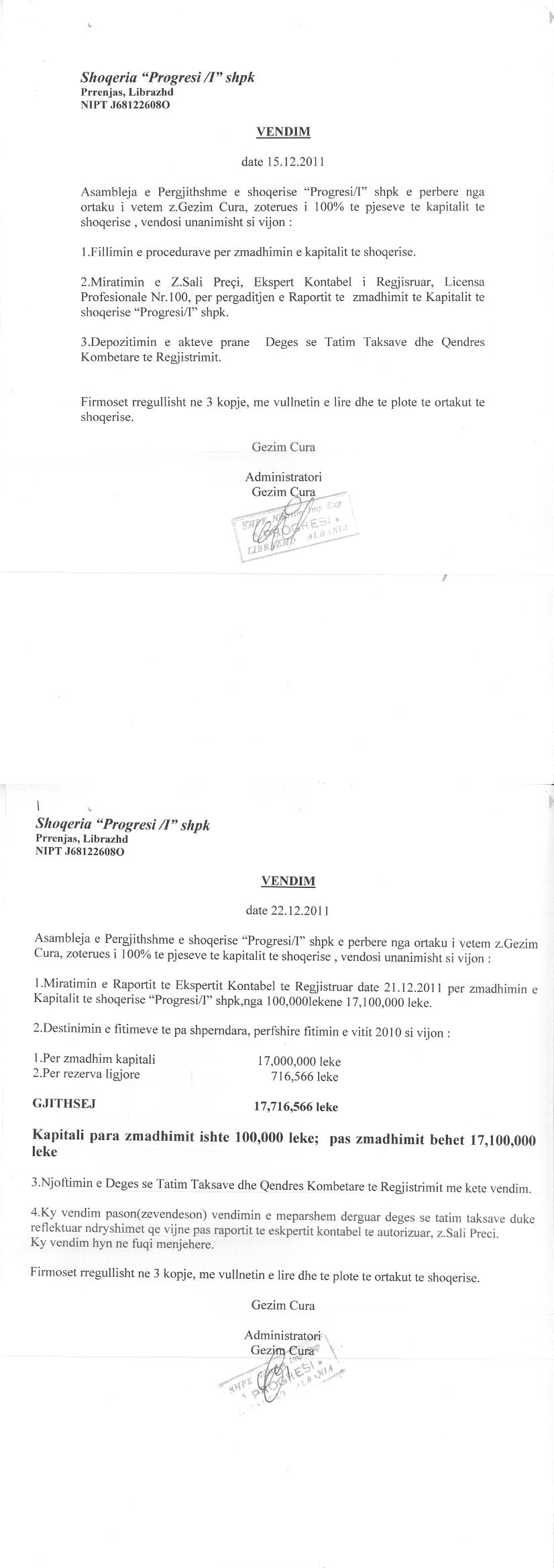→ Ekstrakti Historik i Regjistrit Tregtar date 02.02.2022 → Statuti i Shoqerise dhe dokumenta te ndryshem → Vendim i asamblese se pergjithshme date 22.12.2011 |