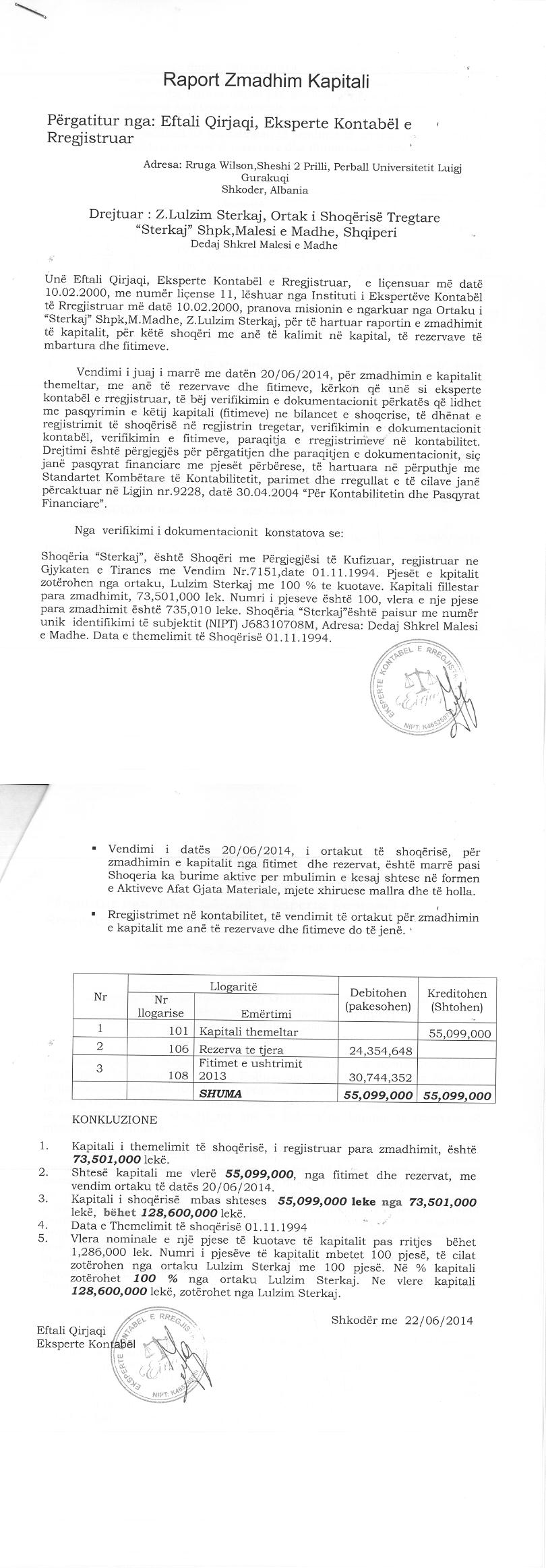 → Ekstrakt historik i regjistrit tregtar 24.02.2021 → Akti i themelimit dhe statuti → Vendimi per zmadhimin e kapitalit 08.09.2017 → Raport per zmadhimin e kapitalit 22.06.2014 → Kontrate shitje kuotash 04.06.2008 → Raport i ekspertit per zmadhimin e kapitalit 26.05.2010 → Vendim i ortakut te vetem per zmadhimin e kapitalit 07.11.2008 → Ekstrakti Historik i Regjistrit Tregtar date 10.05.2023 → Ekstrakti Historik i Regjistrit Tregtar date 10.08.2023 → Ekstrakt Historik i Regjistrit Tregtar date 09.12.2024 |