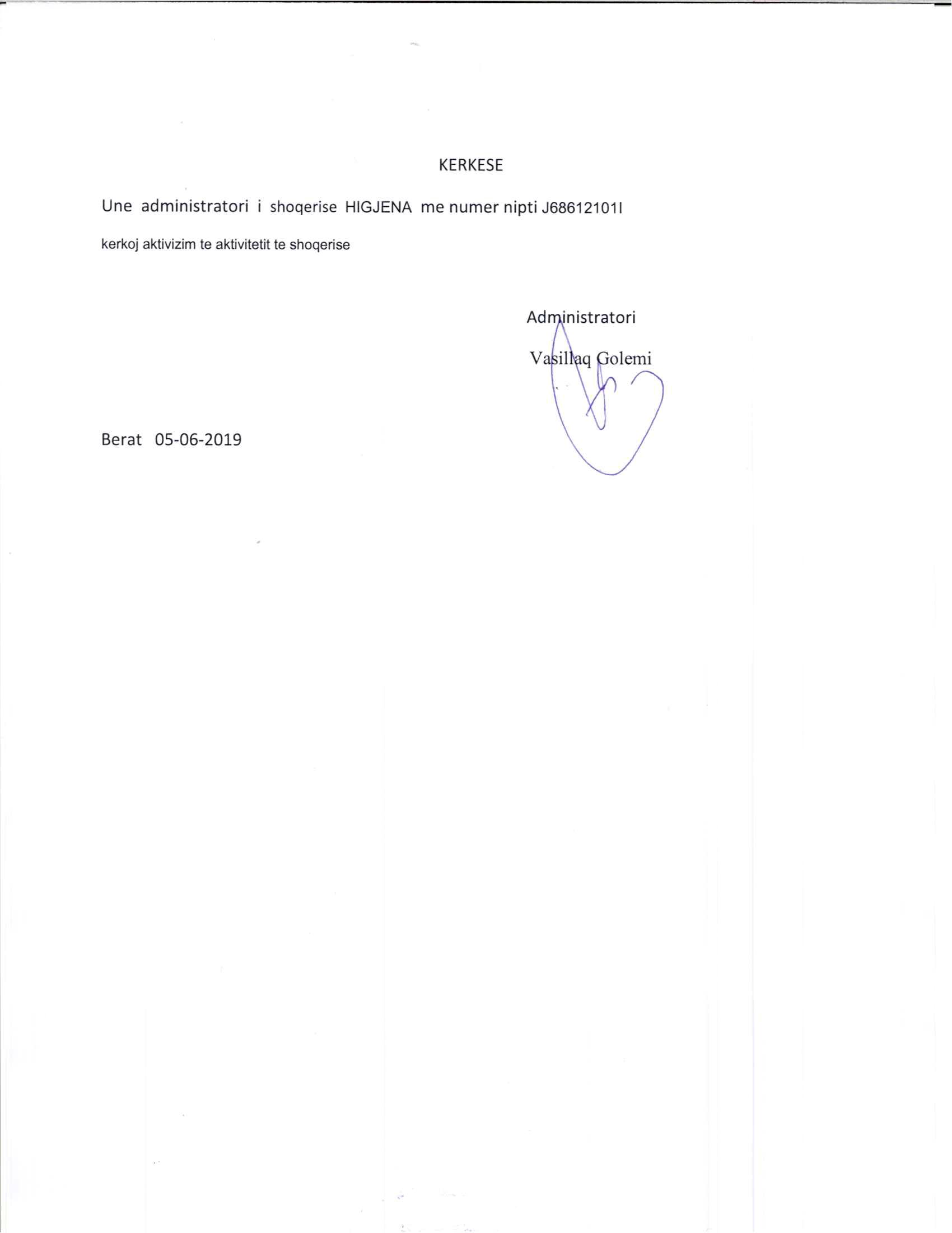 | Çështje Ligjore: | I. Me date 02.05.2019, me kerkese te administratorit, u pezullua aktiviteti i shoqerise per nje afat kohor te pacaktuar. Statusi i shoqerise kaloi nga: “Aktiv” ne “Pezulluar”. II. Me date 05.06.2019, me kerkese te administratorit , u aktivizua veprimtaria e shoqerise duke kaluar ne statusin “Aktiv”. III. Me date 12.06.2019, me kerkese te administratorit, u pezullua veprimtaria e shoqerise per nje afat kohor te pacaktuar. IV. Me date 19.06.2019, me kerkese te administratorit, u aktivizua veprimtaria e shoqerise duke kaluar ne statusin “Aktiv”. V. Me date 27.06.2019, u pezullua perkohesisht aktiviteti i shoqerise. Statusi kthehet ne “Pezulluar”. VI. Me date 15.07.2019, me kerkese te administratorit, u aktivizua veprimtaria e shoqerise. Statusi kthehet perseri ne “Aktiv”. VII. Me date 06.08.2019, me kerkese te administratorit, u pezullua aktiviteti i shoqerise per nje afat kohor te pacaktuar. Satusi i shoqerise behet “Pezulluar”. VIII. Me date 11.10.2019, me kerkese te administratorit, u aktivizua veprimtaria e shoqerise duke u kthyer ne statusin “Aktiv”. IX. Me date 16.10.2019, me kerkese te administratorit, u pezullua perkohesisht aktiviteti i shoqerise. Statusi i shoqerise kalon ne “Pezulluar”. X. Me date 26.12.2019, me kerkese te administratorit te shoqerise, u aktivizua veprimtaria e shoqerise duke u kthyer ne statusin “Aktiv”. XI. Me date 17.01.2020, u pezullua aktiviteti i shoqerise duke u kthyer ne statusin “Pezulluar”. XII. Me date 23.06.2020, u aktivizua veprimtaria e shoqerise. Statusi i shoqerise behet “Aktiv”. XIII. Me date 29.06.2020, u pushua perkohesisht aktiviteti i shoqerise per nje periudhe te pacaktuar. XIV. Me date 24.07.2020, u aktivizua veprimtaria e shoqerise. Statusi i shoqerise kalon ne “Aktiv”. XV. Me date 04.08.2020, u pezullua aktiviteti i shoqerise. Statusi kaloi ne “Pezulluar”. XVI. Me date 11.12.2020, me kerkese te administratorit, u aktivizua veprimtaria e shoqerise. Statusi i shoqerise u ndryshua ne “Aktiv”. XVII. Me date 23.12.2020, u pushua perkohesisht veprimtaria e shoqerise. Statusi kthehet ne “Pezulluar”. XVIII. Me date 29.03.2021, me vendim te administratorit dhe ortakut te vetem, u aktivizua veprimtaria e shoqerise duke u kthyer ne statusin “Aktiv”. |