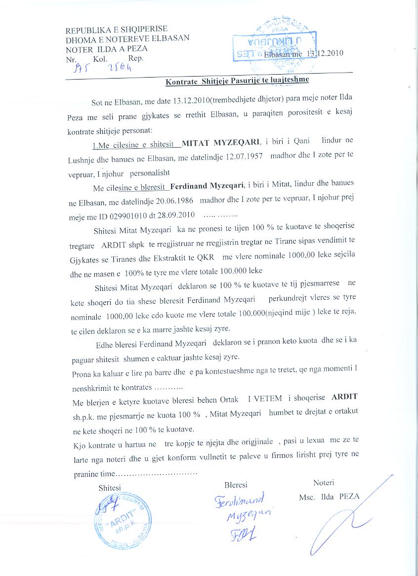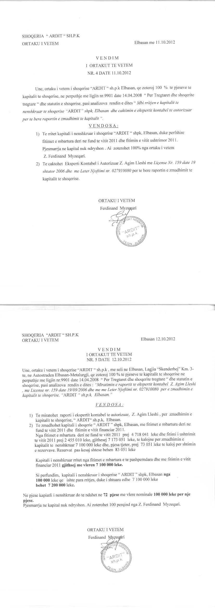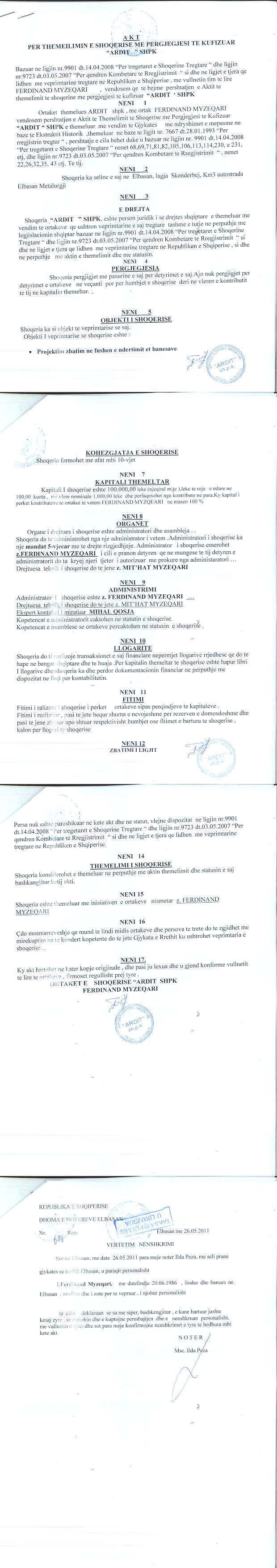 → Ekstrakti Historik i Regjistrit Tregtar date 13.12.2021 → Akti i themelimit te Shoqerise → Kontrate e Shitjes se Kuotave date 13.12.2010 → Vendim i ortakut te vetëm per rritjen e kapitalit date 12.10.2012 |