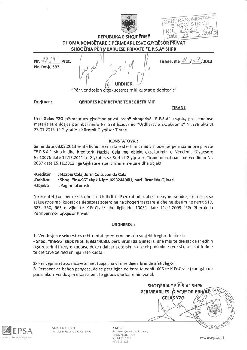 | Çështje Ligjore: | I. Sipas Urdhrit Nr.2795 Prot., Nr.Dosje 533, date 11.03.2013, lëshuar nga Shoqëria Përmbaruese Private “E.P.S.A” sh.p.k., u urdherua vendosja e sekuestros mbi kuotat qe zoteron ne cdo subjekt tregtar Shoqeria “Ina-96” sh.p.k., me NUIS(NIPT)-J69324408U, me perf. Brunilda Gjineci, si dhe mbi te 6 drejtat qe rrjedhin nga zoterimi i ketyre kuotave duke ndaluar tjetersimin ose disponimin e tyre si dhe ushtrimin e te drejtave qe rrjedhin nga keto kuota”. II. Sipas Urdhrit Nr.11243 Prot., Nr.Dosje 533, date 02.12.2013, lëshuar nga Shoqëria Përmbaruese Private “E.P.S.A” sh.p.k., u vendos sekuestro mbi kuotat qe zoteron ne cdo subjekt tregtar debitori Shoqeria “INA - 96” sh.p.k., me NUIS(NIPT)- J69324408U, me perfaqesues ligjor Brunilda Gjineci, si dhe mbi te drejtat qe rrjedhin nga zoterimi i ketyre kuotave duke ndaluar tjetersimin ose disponimin e tyre si dhe ushtrimin e te drejtave qe rrjedhin nga keto kuota”. III. Sipas Vendimit Nr.9739, date 01.10.2013, te Gjykates se Rrethit Gjyqesor Tirane, u vendos pranimi i padise se pales paditese shoqeria “Ina 96” sh.p.k dhe anullimin e veprimeve permbarimore te kryera nga shoqeria permbarimore private “E.P.S.A.” sh.p.k. (permbarues gjyqesor Gelaz Yzo), te kryera ndaj pales paditese shoqeria “Ina 96” sh.p.k., ne zbatim te titullit ekzekutiv per te cilin eshte leshuar urdhri i ekzekutimit me vendimin gjyqesor nr.239 akti, date 23.01.2013 te Gjykates se Rrethit Gjyqesor Tirane dhe urdherimin e pales se paditur shoqeria permbarimore private “E.P.S.A.” sh.p.k., te rifilloje veprimet permbarimore per ekzekutimin e titullit ekzekutiv me lajmerimin per ekzekutim vullnetar. IV. Sipas Urdhrit Nr.1028, datë 24.03.2016, lëshuar nga Përmbarues Gjyqësor Privat Zef Macaj, u urdherua vendosja e sekuestros konservative mbi kapitalin dhe kuotat e debitorit Shoqeria “ Ina – 96” shpk, me Nipt : J69324408U, ne masen e detyrimit 3 918 283 (Tre million e nenteqind e tetembedhjete mije e dyqind e tetedhjete e tre) leke. V. Sipas Urdhrit Nr.1354, date 03.02.2017 protokolluar nga QKB me Nr. 1807Prot., date 07.02.2017, leshuar nga permbarues gjyqesor Zef Macaj, ku eshte urdheruar: Heqja e sekuestros konservative e vendosur mbi kapitalin dhe aksionet e debitorit Shoqeria “INA-96”shpk me Nipt J69324408U. |