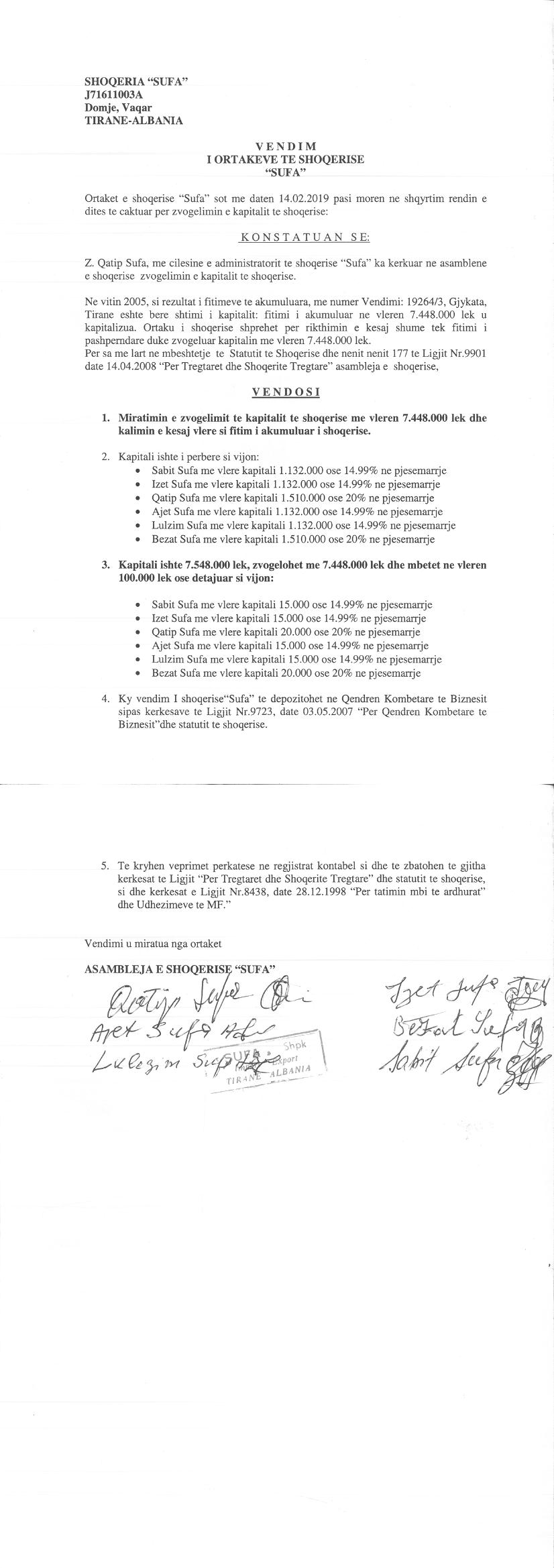 | Çështje Ligjore: | I.Me date 21.02.2008, eshte ndryshuar lloji i pronesise nga "Shqiptare (100%)") ne ("E Përbashkët (shqiptare - e huaj)"). II.Me date 17.10.2012, eshte depozituar urdheri Nr. 31759 Prot. leshuar nga shoqeria "Sherbimi Permbarimor ZIG" sh.p.k, per vendosjen e mases se sekuestros konservative ne aktivet e pales debitore Qatip Mexhit Sufa, qe zoteron ne subjektin 5 "SUFA" sh.p.k me NUIS (NIPT) - J71611003A, Sabit Mexhit Sufa qe zoteron ne subjektin "SUFA 1" sh.p.k me NUIS (NIPT) - K81521017T, "MEGA & AL" sh.p.k me NUIS (NIPT) - K96907402S, si dhe ne aktivet qe zoterojne ne shoqerite e tjera te regjistruara prane jush. Aktivet e mesiperme do te qendrojne te sekuestruara deri ne nje urdherese te dyte. III.Me date 17.01.2014, eshte depozituar urdheri Nr.01411 Prot., "Per Heqjen e Sekuestros Konservative”, leshuar nga Shoqeria “Sherbimi Permbarimor ZIG” sh.p.k, drejtuar QKB-se, ku eshte urdheruar: Heqja e mases se sekuestros konservative te vendosur me shkresen nr.31759 Prot., date 17.10.2012, ne aktivet tregtare te regjistruara prane jush, te z.Qatip Mexhit Sufa dhe te Sabit Mexhit Sufa. IV. Me date 29.10.2021, eshte ndryshuar lloji i pronesise nga "E Përbashkët (shqiptare - e huaj)" u be "Shqiptare (100%)". V. Me date 02.11.2021, eshte ndryshuar lloji i pronesise nga "Shqiptare (100%)") ne ("E Përbashkët (shqiptare - e huaj)"). |