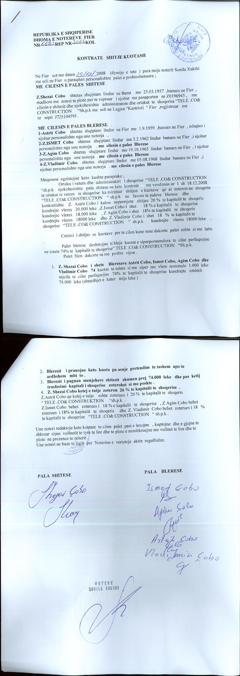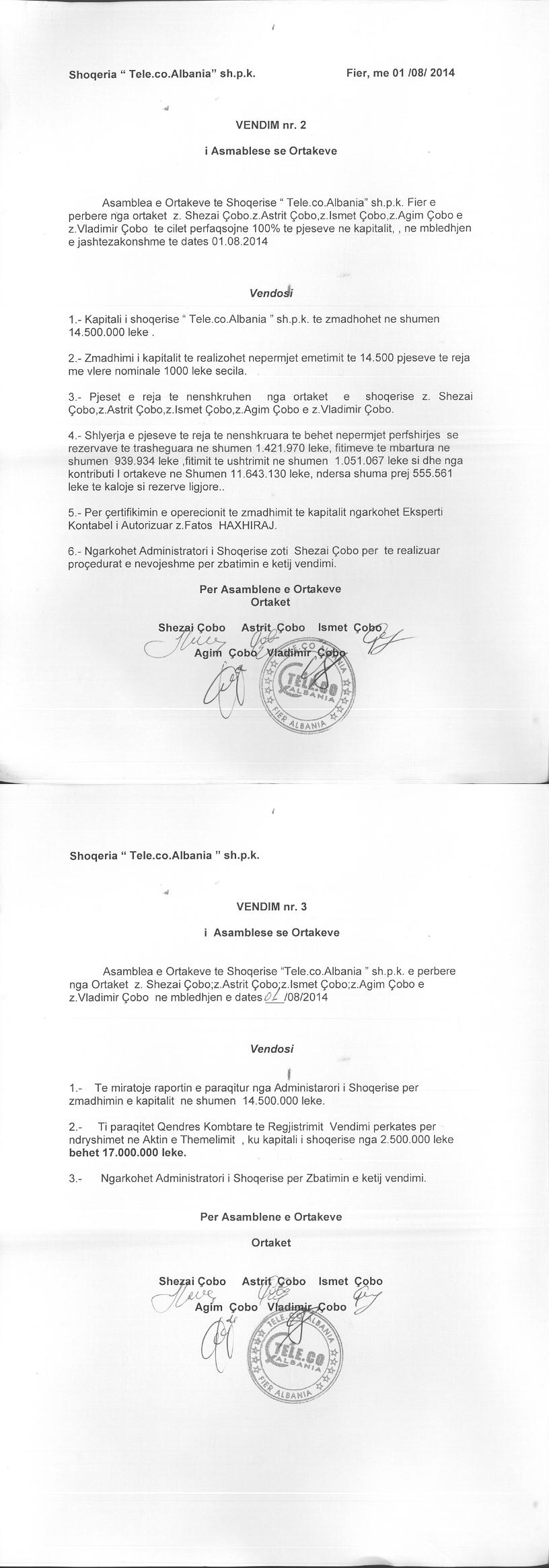 → Ekstrakt historik i regjistrit tregtar 17.12.2022 → Akti i themelimit dhe statuti → Kontrate shitje kuotash date 28.12.2008 → Vendimi i asamblese se ortakeve per zmadhimin e kapitalit date 01.08.2014 |