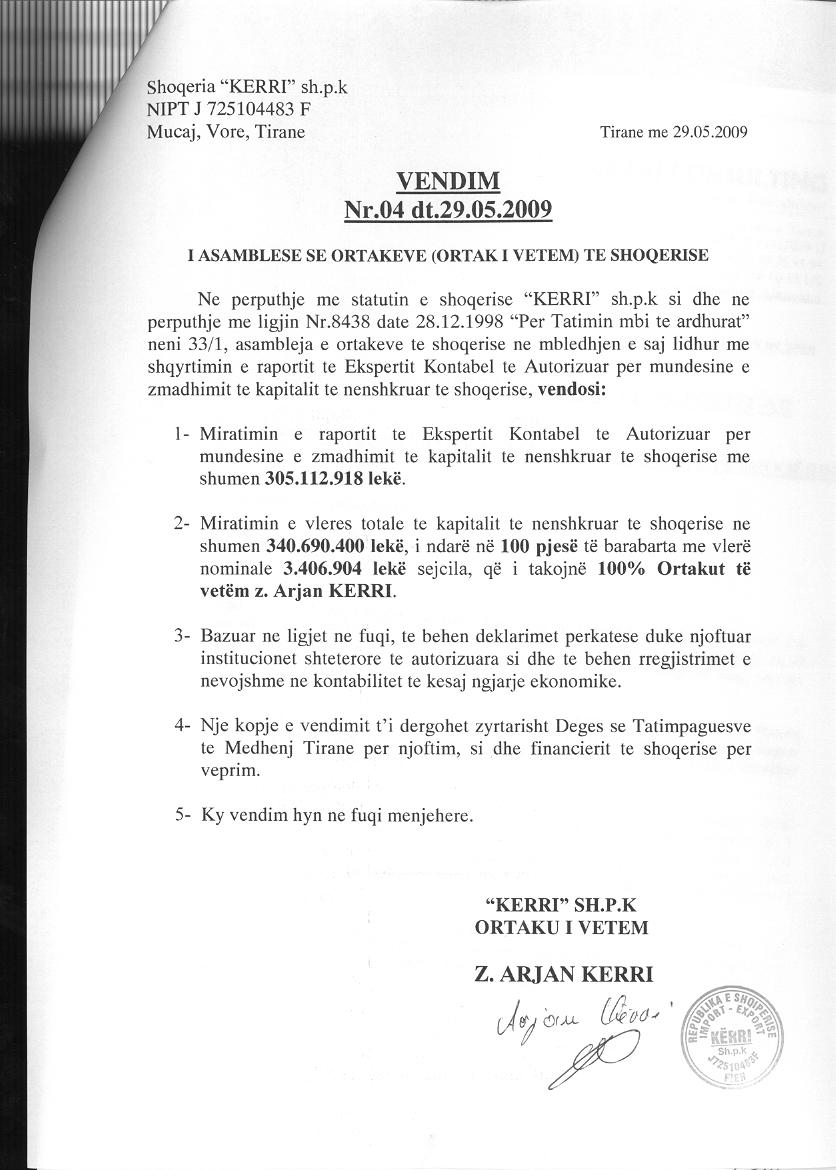 → Ekstrakt Historik i Regjistrit Tregtar date 12.06.2024 → Akt themelimi dhe Statuti i Shoqerise → Dokumente të Ndryshme → Kontratë Dhurimi datë 12.11.1999 → Vendim i Ortakut të Vetëm, Zmadhim Kapitali datë 15.12.2004 → Vendim i Ortakut të Vetëm, Zmadhim Kapitali datë 29.05.2009 → Raport i Ekspertit Kontabël për Zmadhimin e Kapitalit datë 28.05.2009 → Urdhër për Heqjen e Sekuestros datë 05.02.2013 → Urdhër për Vënien e Sekuestros datë 24.04.2014 → Urdhër për Heqjen e Sekuestros datë 29.04.2014 → Vendim i Ortakut të Vetëm, Zmadhim Kapitali datë 06.12.2021 |